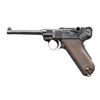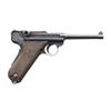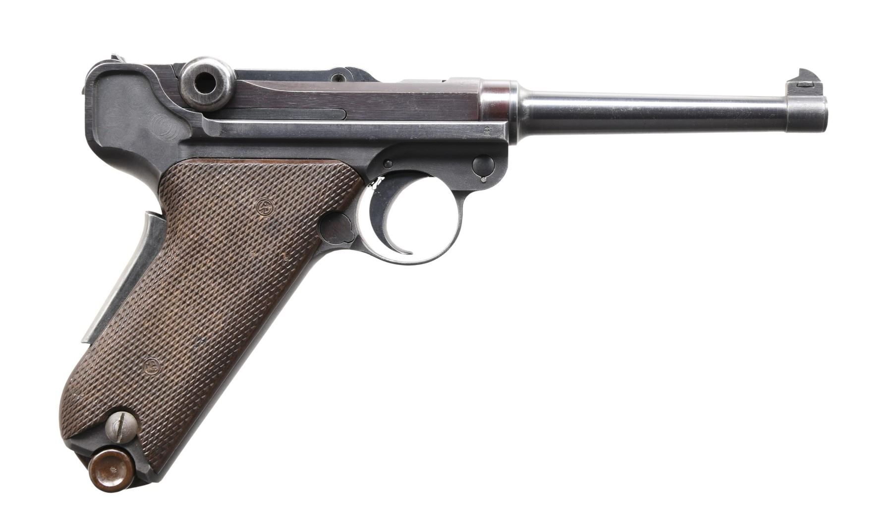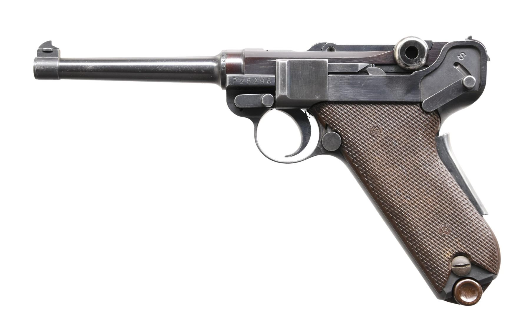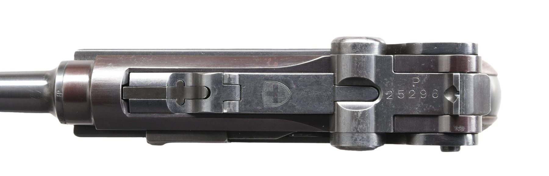 LUGER SEMI-AUTOMATIC PISTOL. Cal. 30 Luger. S# P25296. Bbl. 4 3/4". One of 1,600 Swiss Model 1929 Luger semi-automatic pistols mfg. by Waffenfabrik Bern for civilian sales. This example is stamped with the S# "P25296" on the left side of the frame ("P" prefix indicating "Privat" commercial sales), with a small inspection proof stamped on the right, and the Waffenfabrik Bern "W+F" logo marked on the rear of the frame. Interior of frame is marked with the date code "5.40" (indicating mfg. in May of 1940). Rear frame well and underside of bbl. extension are marked with a Rifle/N, indicating sub-contracted mfg. by SIG Neuhausen. Toggle is marked with the Swiss Federal cross within a shield. Metal components exhibit a blue finish overall. Frame is mounted with 2-piece brown checkered plastic grips. Blade front sight, with U-notch rear sight. All serialized parts are matching and include the frame, sideplate, bbl., and bbl. extension. MAGS: one 8-rd. with Swiss brown plastic bottom. CONDITION: metal components retain the majority of their original arsenal blue finish, exhibiting some light edge wear overall, with mild wear present on the toggle "ears." Frame exhibits some light to mild surface oxidation and pitting, with the bluing appearing to have been touched up in a few places. Rear toggle link exhibits mild pitting. Near mirror bore, exhibiting mild to moderate pitting primarily around the muzzle while retaining well-defined rifling throughout. Grips show light to mild smoothing, as well as some nicks to the diamonds from handling and storage, but otherwise remain sturdy and serviceable. (24-4126/MLW). CURIO. $800-1,400.