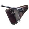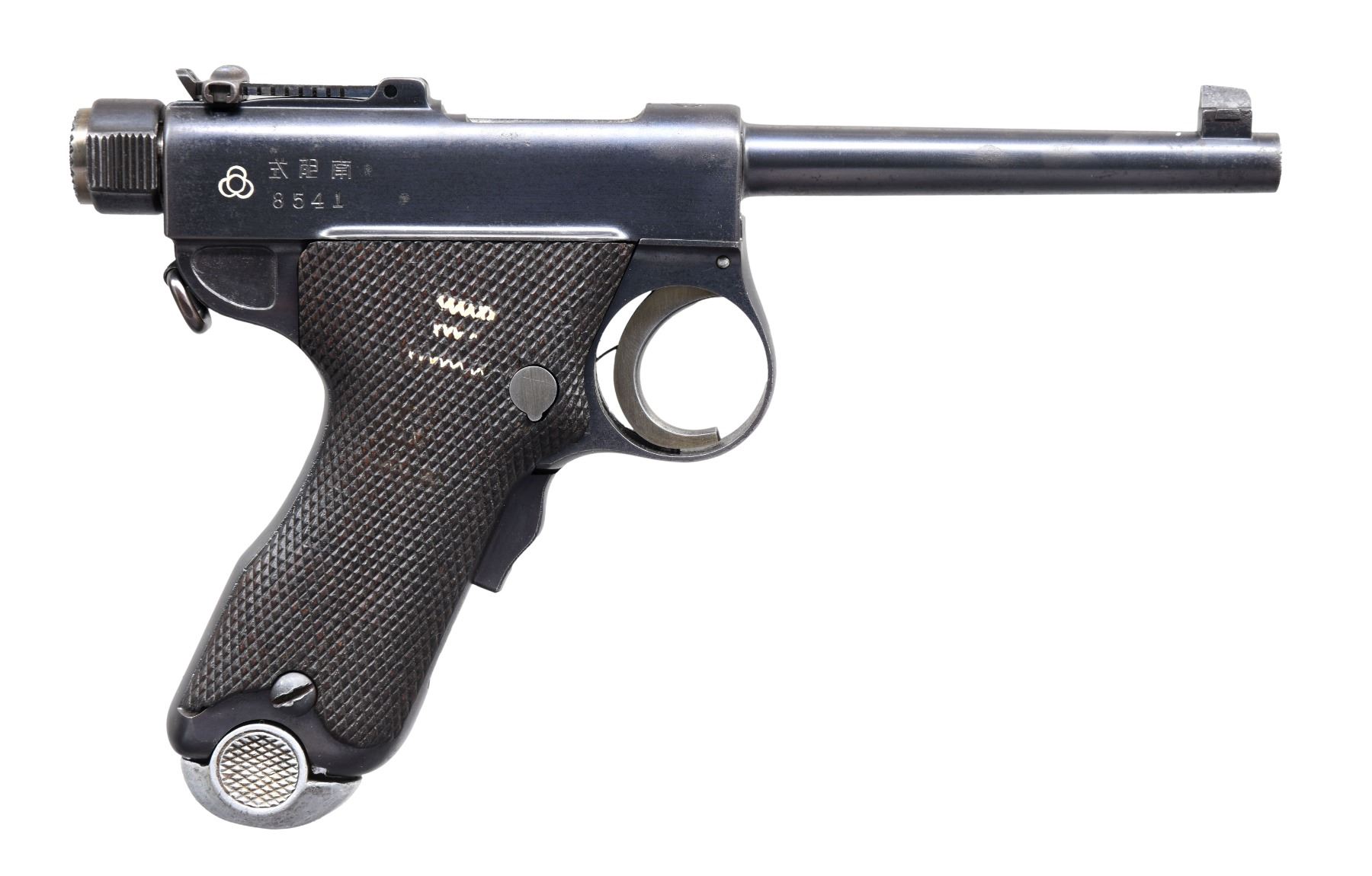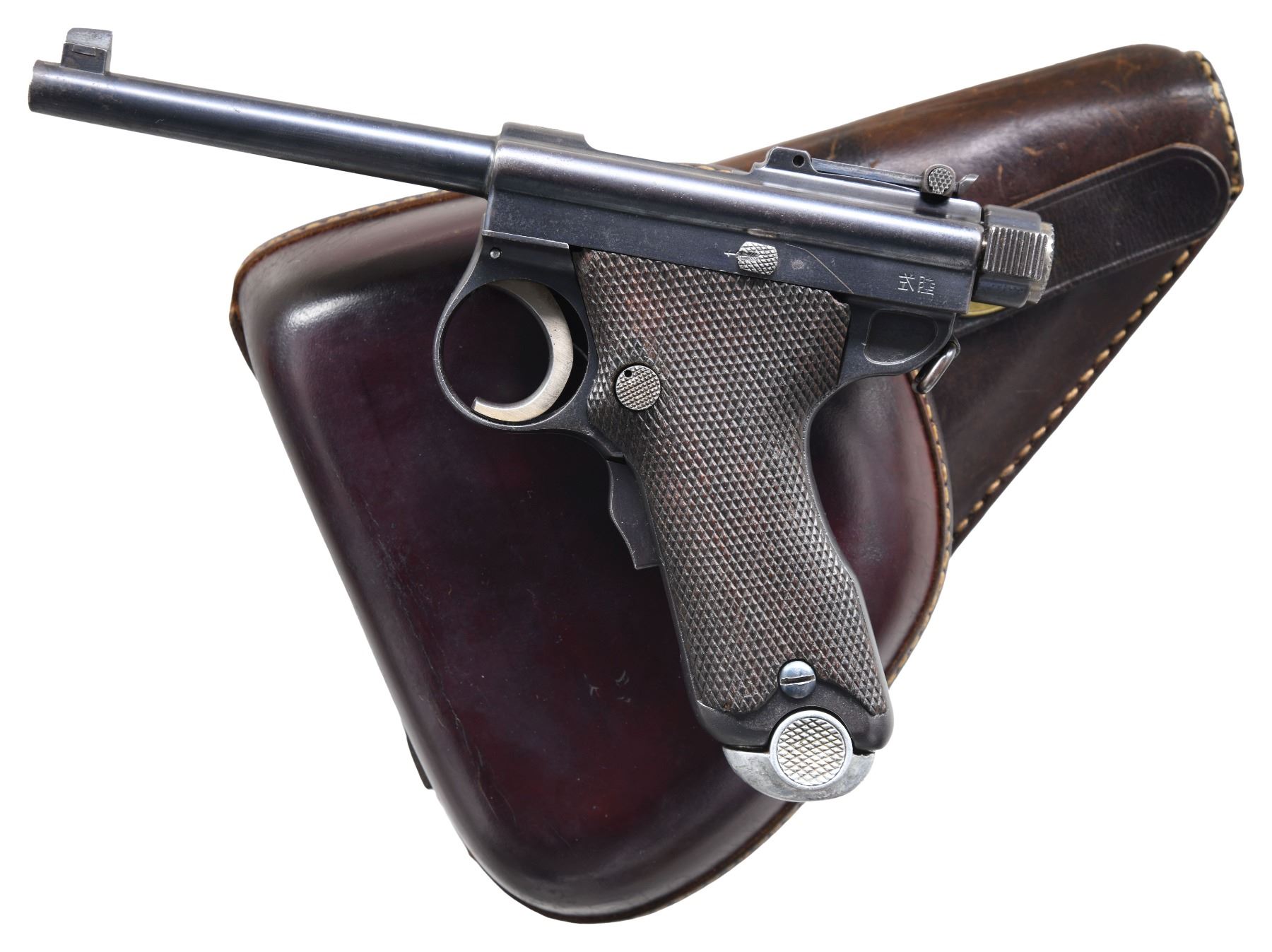 MODEL 1902 "PAPA" NAMBU SEMI-AUTOMATIC PISTOL WITH HOLSTER, MENTIONED IN "JAPANESE MILITARY CARTRIDGE HANDGUNS", BY DERBY & BROWN. Cal. 8mm Nambu. S# 8541. Bbl. 4 3/4". Model 1902 Modified "Papa" Nambu semi-automatic pistol mfg. by TGE (Tokyo Gas & Electric) and the Tokyo Artillery Arsenal. After the adoption of the Type 14 Nambu in 1925, the Tokyo Artillery Arsenal transferred all existing parts, tooling, and dies to TGE, as TGE became responsible for the Imperial Japanese army's "Papa" Nambu production. Subsequent to the Type 14 Nambu's adoption, demand for the "Papa" decreased significantly, with approx. 500 pistols assembled by TGE from Tokyo Arsenal parts before production was terminated. These approx. 500 pistols, are unique in TGE production, as they were made utilizing Tokyo Arsenal frames, and as such are dual marked with both mfg.'s insignias. This example is mentioned by S# on pg. 50 of "Japanese Military Cartridge Handguns 1983-1945", by Harry L. Derby III & James D. Brown, which states "The bulk of Tokyo symbol markings, however, show up during the 8,000 serial series (serial nos. 8017-8541).The frame exhibits standard Kanji characters on the left and right sides, with the TGE insignia marked over the top of the chamber, and the Tokyo Artillery Arsenal marked on the right, preceding the S#. Major metal components exhibit a mixture of what appears to be both original and reapplied blue finishes. Trigger exhibits a reheated straw finish. Bolt, firing pin, and locking block are polished in-the-white. Frame is mounted with 2-piece checkered wood grips, with the right panel retaining traces of its original Kanji characters that were applied in white paint. Dovetailed blade front sight, with tangent V-notch rear sight, graduated 1-5. All serialized parts are matching and include the frame, trigger guard assembly, mag. release button, mainspring guide rod, bbl. / bbl. extension, ejector, locking block, bolt, firing pin, cocking knob, firing pin spring guide, as well as the grips. MAGS: 1 unnumbered 8-rd. UNATTACHED ACCESSORIES: corrected unmarked brown leather clamshell holster, with ammunition pouch on front of body, beneath the closure flap, brown leather shoulder strap, as well as what appears to be a reproduction lanyard. CONDITION: very good, with metal components retaining the majority of their original and reapplied blue finishes, exhibiting areas of mild wear and thinning, scattered superficial handling marks, areas of light surface oxidation, as well as areas of light to mild pitting, both above and beneath the finish. Bore exhibits consistent dark mild pitting, while retaining fair to good rifling throughout. Grips are good, showing smoothing, some scattered superficial marks from handling and storage, as well as a few chips along the edges. Holster and shoulder strap remain malleable, with the holster exhibiting some wear, some superficial marks from handling and storage, as well as some areas of minor age related cracking and crazing overall. A rare dual mfg. marked Model 2 Modified "Papa" Nambu pistol. (24-6908/MLW). CURIO. $1,500-2,500.
