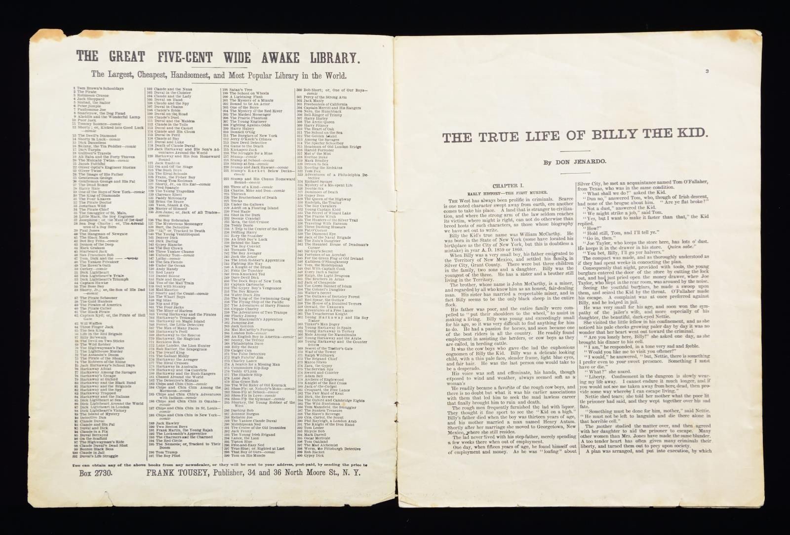 JENARDO, FROM 1881 WIDE AWAKE LIBRARY. 11.25" x 8.75", 16 page pamphlet, published less than 2 months after Billy's death, originally thought to be rare 1st printing, but unknown later edition. CONDITION: good, soiled, stained. PROVENANCE: Martin Lane Historic & Western Americana Lifetime Collection. (02-21933/JS). $200-400.