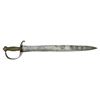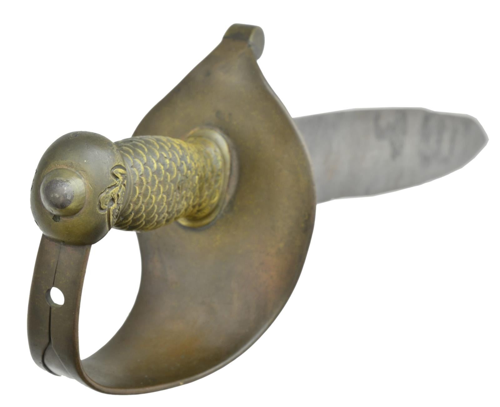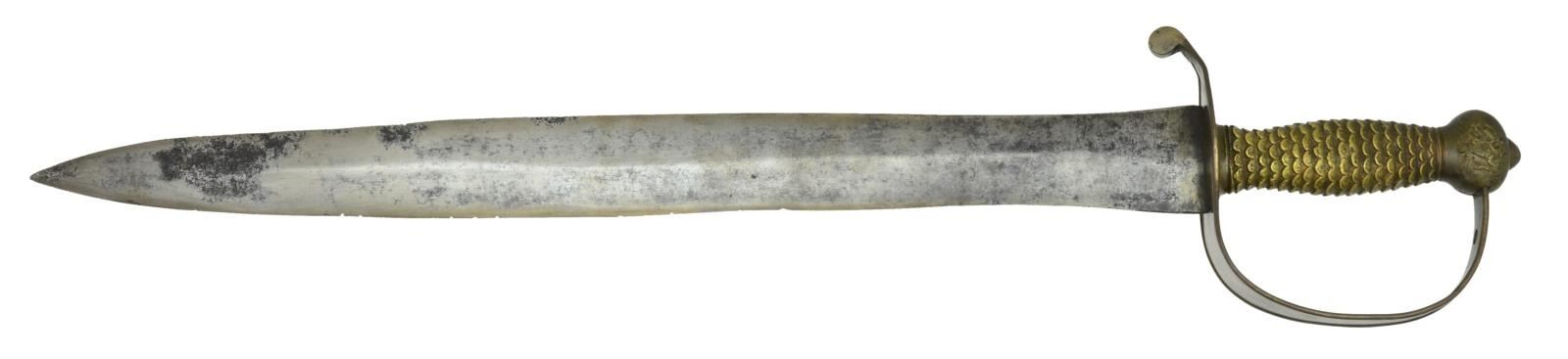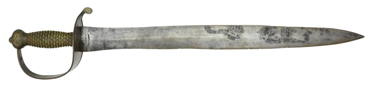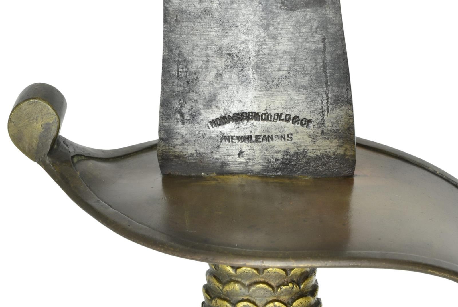 CONFEDERATE NAVAL CUTLASS. 26.5” Overall, 21” wasp waist double edged blade, scarcest of marked Confederate naval cutlasses, "THOMAS, GRISWOLD & CO / NEW ORLEANS" stamped on ricasso. CONDITION: very good overall. Blade cleaned, gray overall w/ pitting & old sharpening, brass hilt has dark mustard patina, slight bend at quillon where construction shows 2 piece braise so typical of New Orleans sword manufacture. (02-15789/JS). $3,000-4,000.