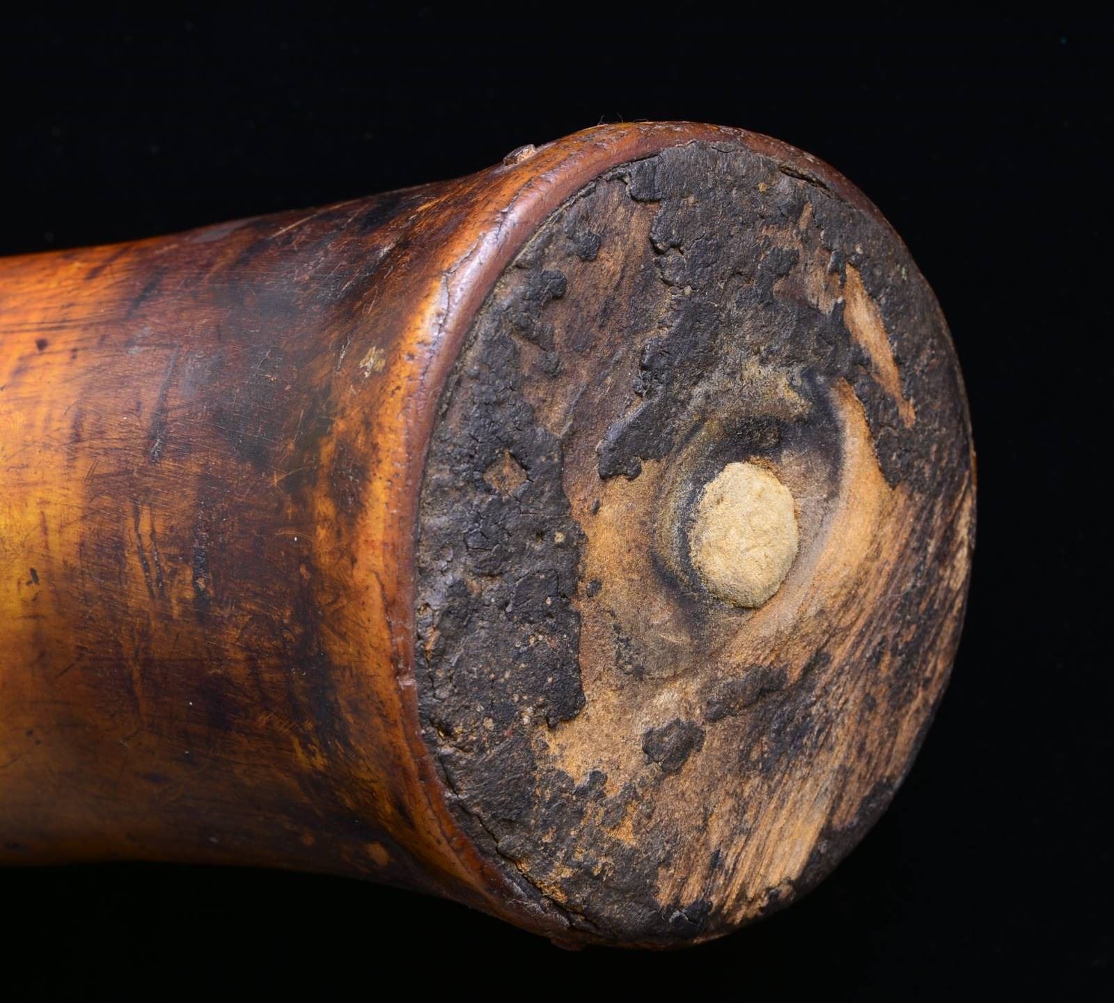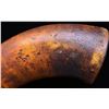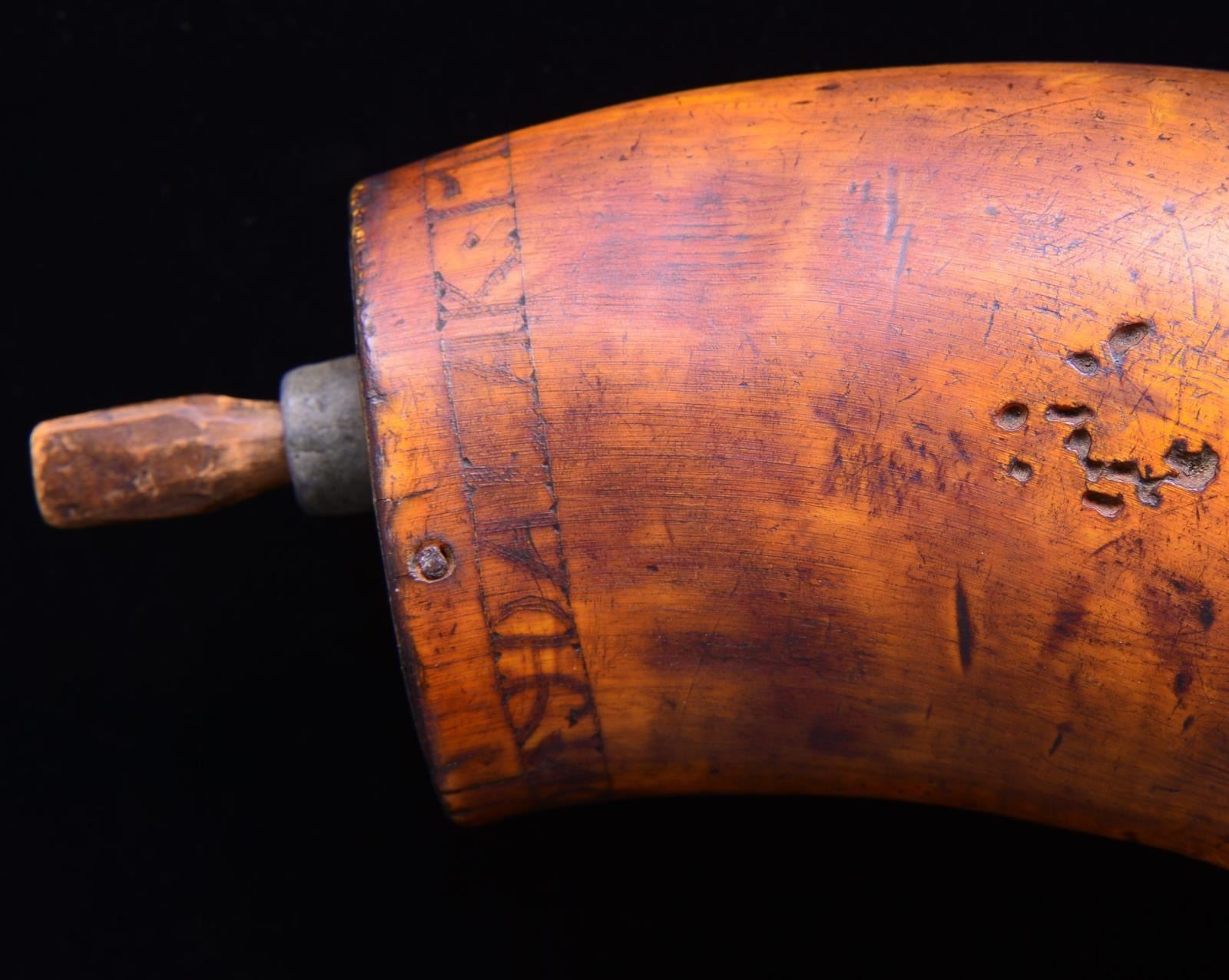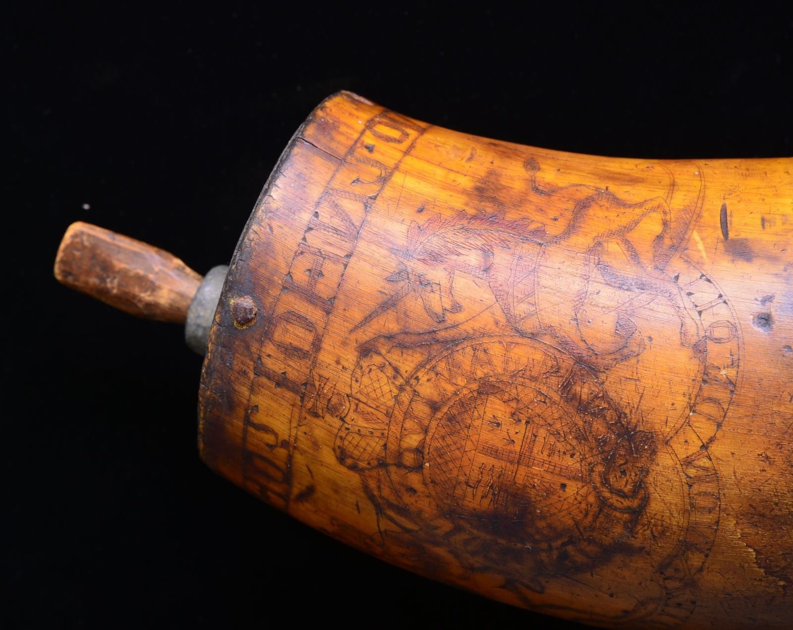 This most unusually large 7" rum horn w/ pewter spout looks like it would hold a pint, 3 1/2" base. Scrimshawed on one side is a lg. British coat of arms & circling above it: “THOs JOHNSON ONYDALAK 1762”. This French & Indian War horn may have been carved at one of the forts near what is now Oneida Lake, as the name is more difficult to decipher than normal. CONDITION: good to very good overall, surface is worn but details all easily discerned, minor erosion & insect damage, good patina. Base plug is leather stopper. PROVENANCE: From the Collection of John "Tim" Breth Jr. (02-13780/JS). $2,000-3,000.