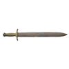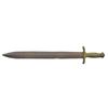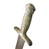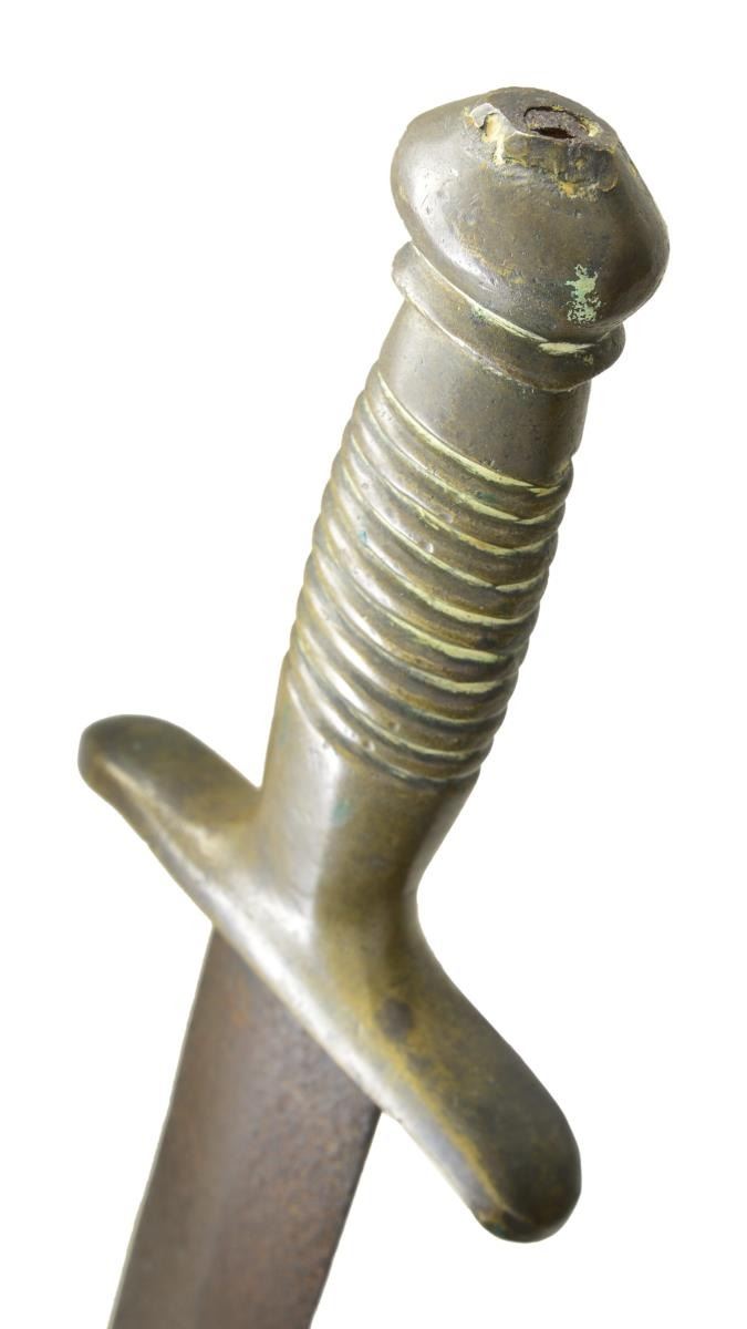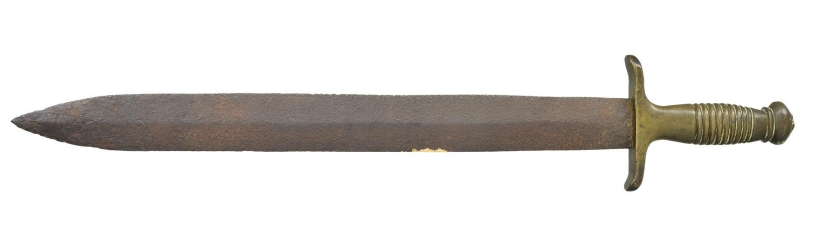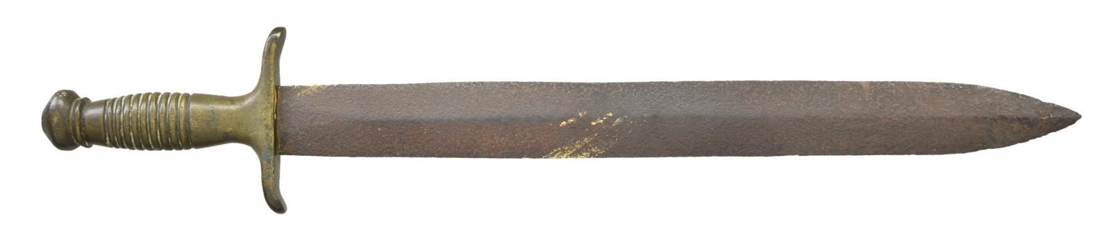 SWORD. 25.25", 19 3/4" double edged blade with raised medial ridge that narrows sharply at hilt . The sculpted sand cast grip is distinct with 10 ridges & turned down 4” cross guard. The late R. E. “Sonny” Neville respected dealer/collector attributed this scarce pattern to Mobile, Alabama and there is captured example from Ft. Morgan. Some are known stamped with large “CS”. At the beginning of the Civil War, the South had few armories and few factories capable of producing arms. Several small arms manufacturers began operations across the vast Southern landscape. This sword is a product of one of those small Southern arms manufacturers that sprang up to fill the needs of the Confederacy. The finest example of this sword was sold on theses floors as lot 1060B, March 14, 2010. CONDITION: good overall, heavy iron patina and pitting to blade. Brass smooth chocolate brown. (02-19079/JS). $2,000-2,500.