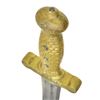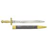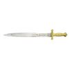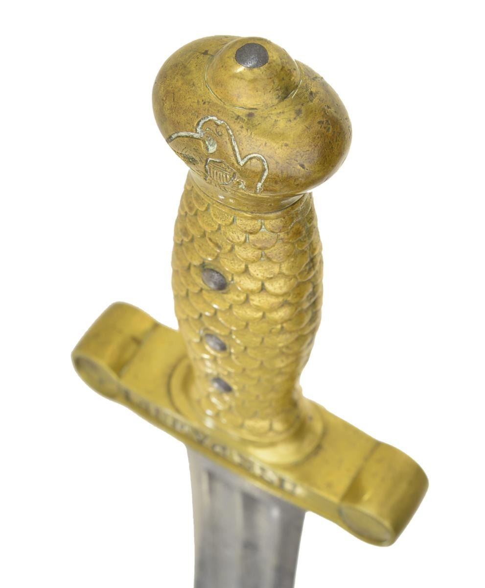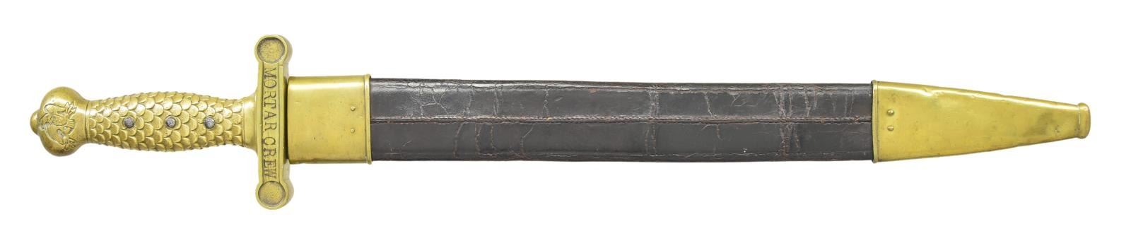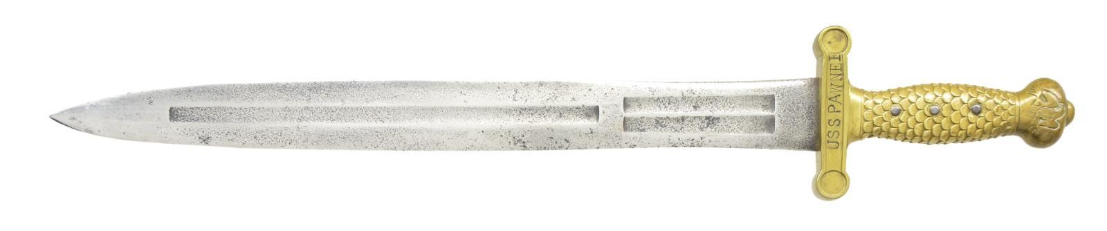 SWORD. Standard configuration of 1832 Ames artillery short sword, 25” overall, 18.75” triple fullered blade stamped in large letters: on either side of cross guard “USS PAWNEE” & “MORTAR CREW”. Few short swords or cutlasses are known with similar inscriptions. USS Pawnee was 220’ sloop of war with 180 man crew, that saw service entire war on Southeast coast, Virginia & Carolinas seeing constant action. This is interesting relic from ship that produced 2 Medal of Honor recipients. CONDITION: good overall, blade is cleaned, polished and pitted with makers marking obliterated, brass scabbard mounts and hilt cleaned & polished & toned to light patina. Scabbard is sound. Inscription crist and presents well. (02-19070/JS). $1,500-2,000.