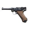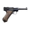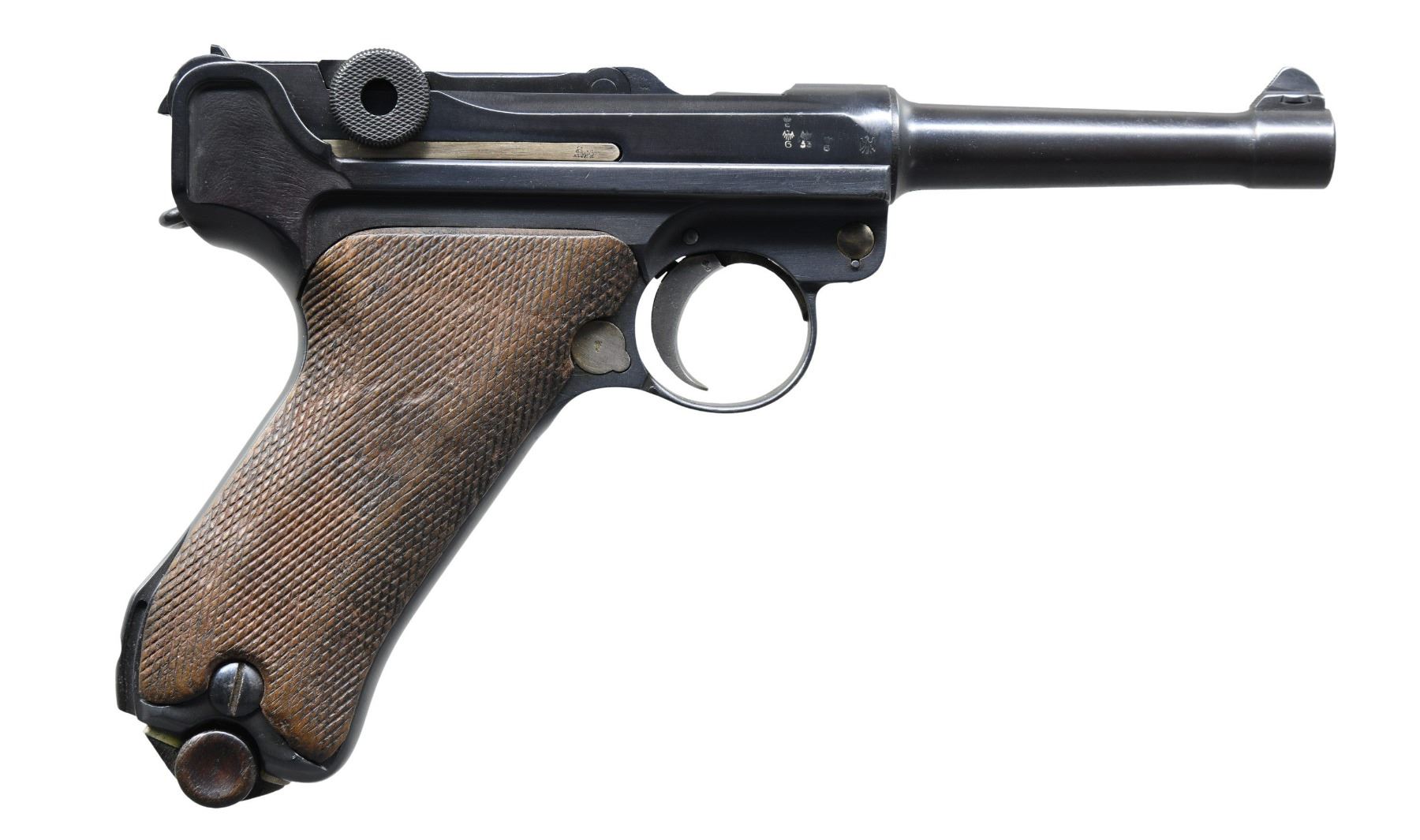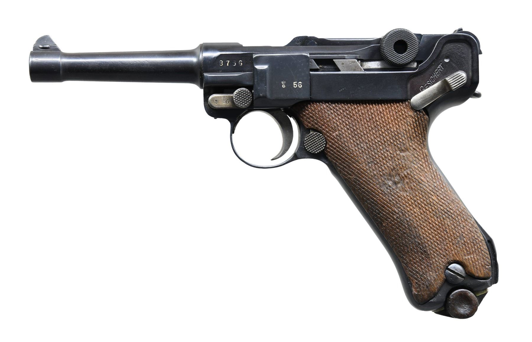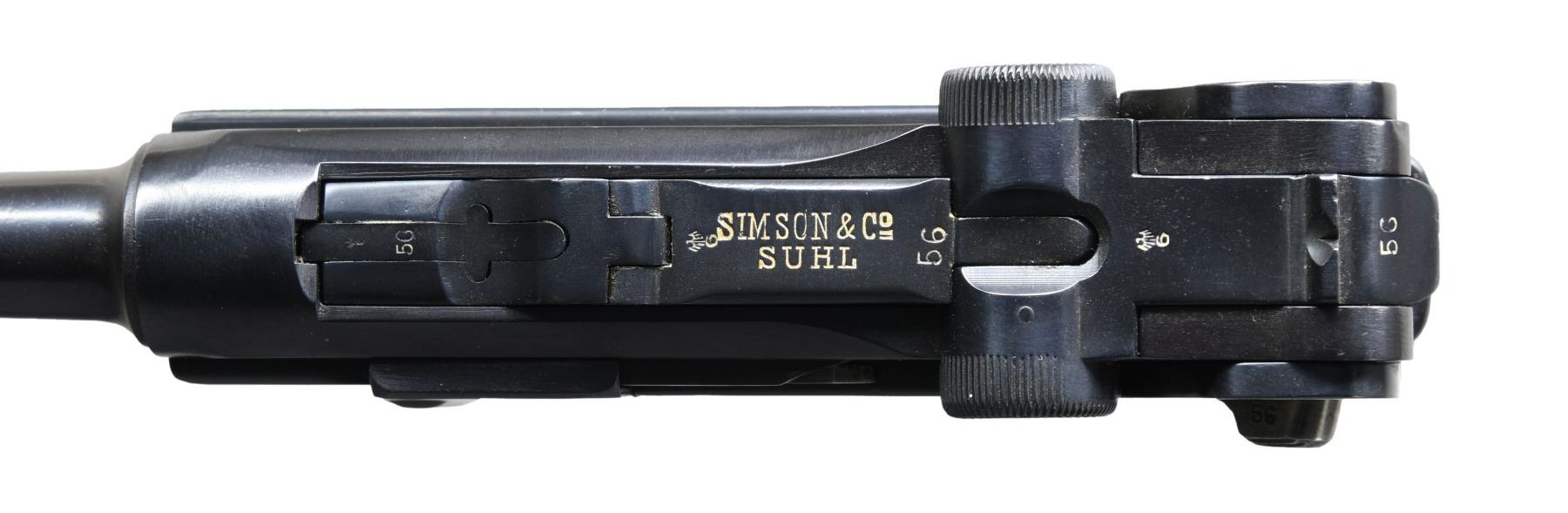 SEMI-AUTOMATIC PISTOL. Cal. 9x19mm. S# 8756. Bbl. 4". Standard configuration P.08 Luger mfg. by Simson during the Weimar era. The bbl. extension is marked with Simson Eagle/6 and Eagle/33 proofs on the right, with Eagle/6 proofs marked on most small parts. Toggle is marked "SIMSON & Co./ SUHL". Metal components exhibit a reapplied blue finish overall, with some small parts exhibiting a reheated straw finish. Frame is mounted with 2-piece checkered wood grips. Nearly all serialized parts are matching, save for the bbl. (#146), firing pin (#37), as well as the grips, which are of WWII production. MAGS: 1 WWI 8-rd. mag., non-matching Erfurt proofed wood plug. CONDITION: metal components retain bountiful amounts of their reapplied blue finish, exhibiting few spots of light wear, with scattered spots/areas of light to mild pitting present beneath the finish overall. Strawed parts show areas of wear, as well as striations from prior cleaning. Bore exhibits consistent mild to moderate pitting, while retaining strong rifling throughout. Proper manual mechanics. Grips show smoothing, scattered handling marks, a few small chips, as well as a few notable impressions, but otherwise remain sturdy and serviceable. (25-3489/MLW). CURIO. $1,000-1,500.