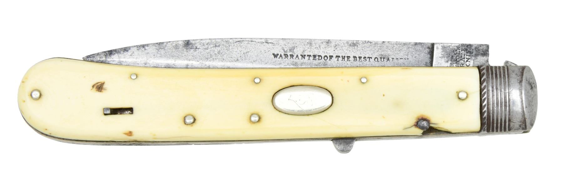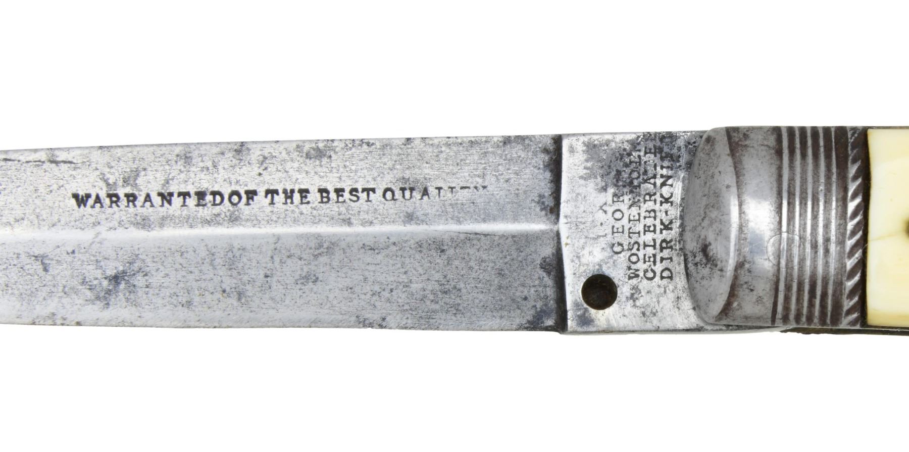 DIRK. 9" overall opened, 4" dagger point blade marked "WARRANTEED OF BEST QUALITY" and "[I*XL] / GEORGE / WOSTENHOLM / CELEBRATED / DIRK-KNIFE", ivory slab grip with raised oval German silver push button, and slotted pin safety. This is among the earliest "switchblade" knives made and works perfectly. UNATTACHED ACCESSORIES: Custom protective sleeve. CONDITION: very good overall, mechanics are fine, strong spring pops blade out with easy push of button, lock holds tight in place, safety functions. Age crack & chip in well patinaed ivory. PROVENANCE: Larry W. Williams lifetime collection. (02-23271/JS). NON-GUN. $2,000-3,000.