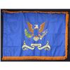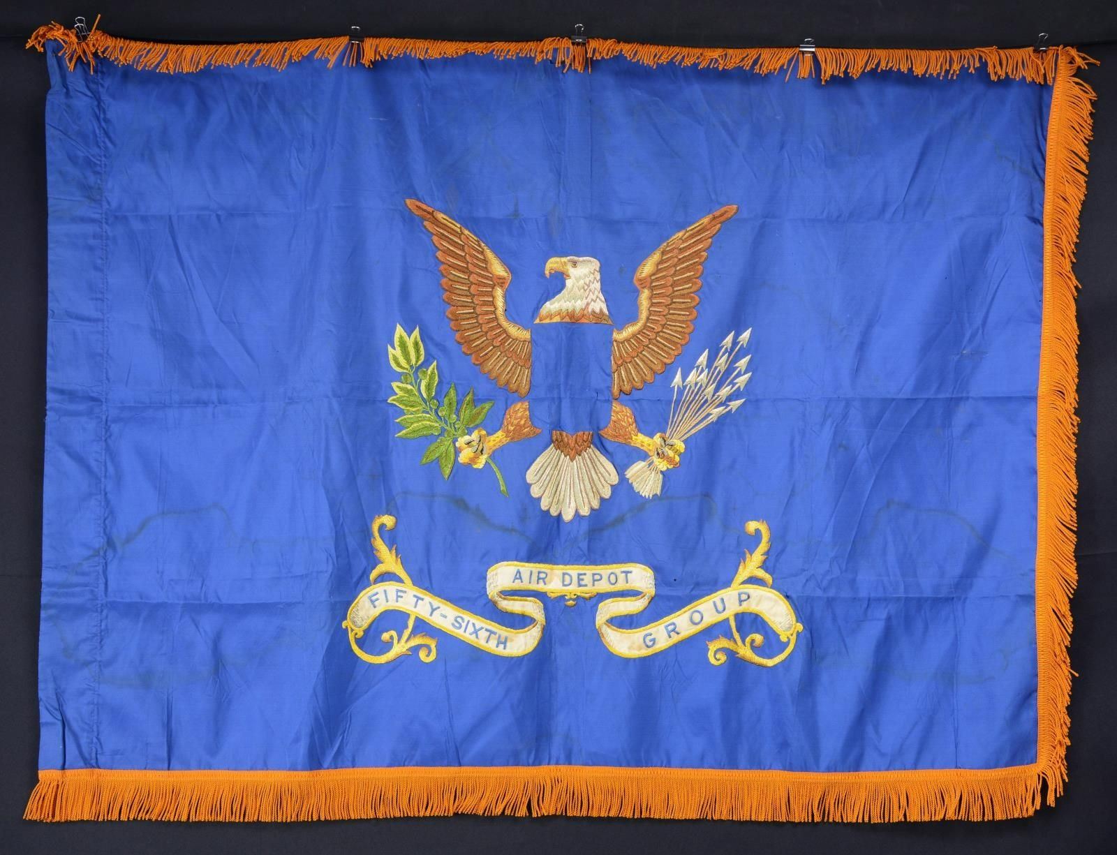 1944. 3' x 4' double applique machine and hand embroidery on aquamarine field, orange fringe, Philadelphia depot label dated April 26, 1944. The 56th Air Depot Group was formed in February 1942 at Patterson Field, now Wright-Patterson Air Force Base. They remained in Ohio until March 1943 before moving to McClellan Filed in California and remained there until November when they transferred to Tinker Field in Oklahoma City. They arrived on Guam on November 9, 1944. In January 1945, the command was awarded a Meritorious Unit Commendation per Army Air Forces General Order 115. When combat aviation was part of the U.S. Army first as the U.S. Army Air Corps and then as World War Two progressed, the U.S. Army Air Forces, Air Depot Groups were created for base support of logistics and maintenance of a base's aircraft. As these groups deployed overseas to both main theaters of the war, the intention for each depot base command was one Service Group for every two combat groups and one Air Depot Group for every two Service Groups. As the chart above details the main functions were supply and maintenance with operations and other support part of the mix. For the Army Air Forces in the Pacific Theater a large Air Depot was placed on Guam after the capture of that island from the Japanese on August 10, 1944. After being secured, Navy Seabees and black Army Engineer battalions turned the island into a massive air base consisting of five large airfields. Two of these would soon host B-29 bombers who could then carry the air war to Japan and other Japanese held islands in the region. Assigned to Guam's Air Depot were the 23rd, 24th, 25th, 55th and 56th Air Depot Groups. The Air Force still uses the ultramarine blue field, the colors for Army aviation and now the U.S. Air Force flags. CONDITION: good overall, a few small holes in field. (02-19982-18/JS). $200-400.
