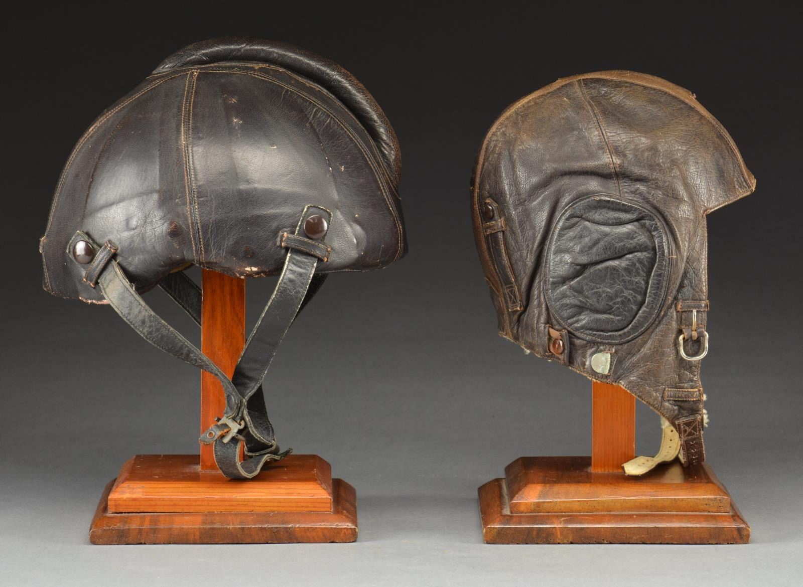 2) A classic LKp W 101 Luftwaffe winter flight helmet. Brown leather helmet w/ fleece interior. Interior tag reads, "De Fe We Deutsche Telephon werke und Kabel-Industrie A. G. Berlin S.O. 36. Ln 26618 Baumuster L Kp. W. 101". A second interior tag reads, "Karl Heisler BERLIN O.27 59". CONDITION: helmet shows light wear overall. (02-16347/BF). $1,600-2,000.