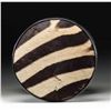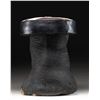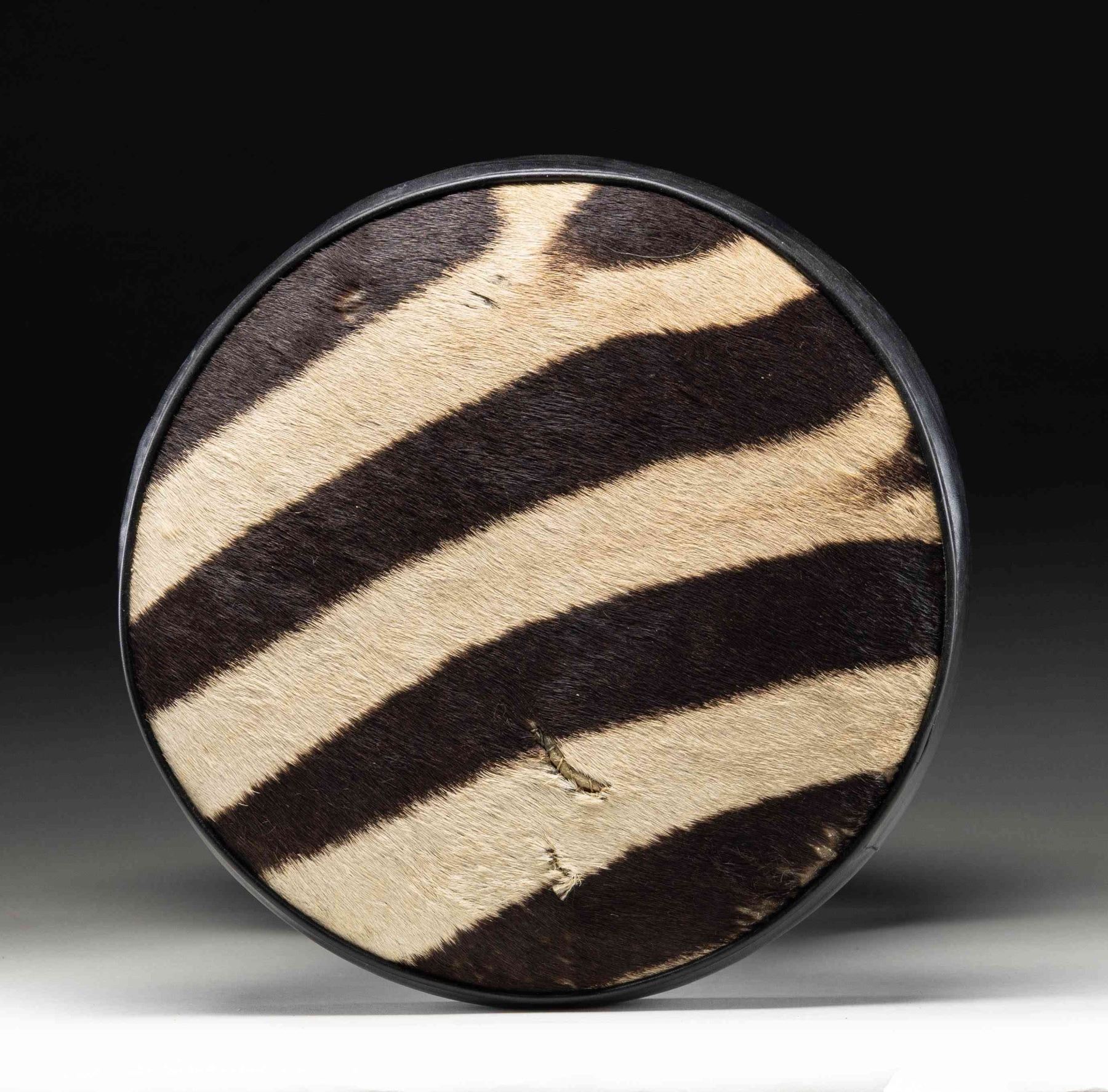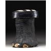 This elephant foot has been made into a sitting stool or foot stool by local craftsmen in India. This example measures approximately 18" in height and approximately 13" in width at the seat. The seat measures approximately 4" in thickness and 40.5" in circumference, with the top covered in striped black & white animal hide. The seat is edged in black leather and the foot itself is painted/dyed black. CONDITION: stool has good appearance with handling wear & stitched cut in top hide. PROVENANCE: from the renowned collection of quality sporting arms from Lewis Drake together with inventory of Lewis Drake Associates. (02-25924-2/MD). NON-GUN. $300-500.