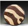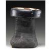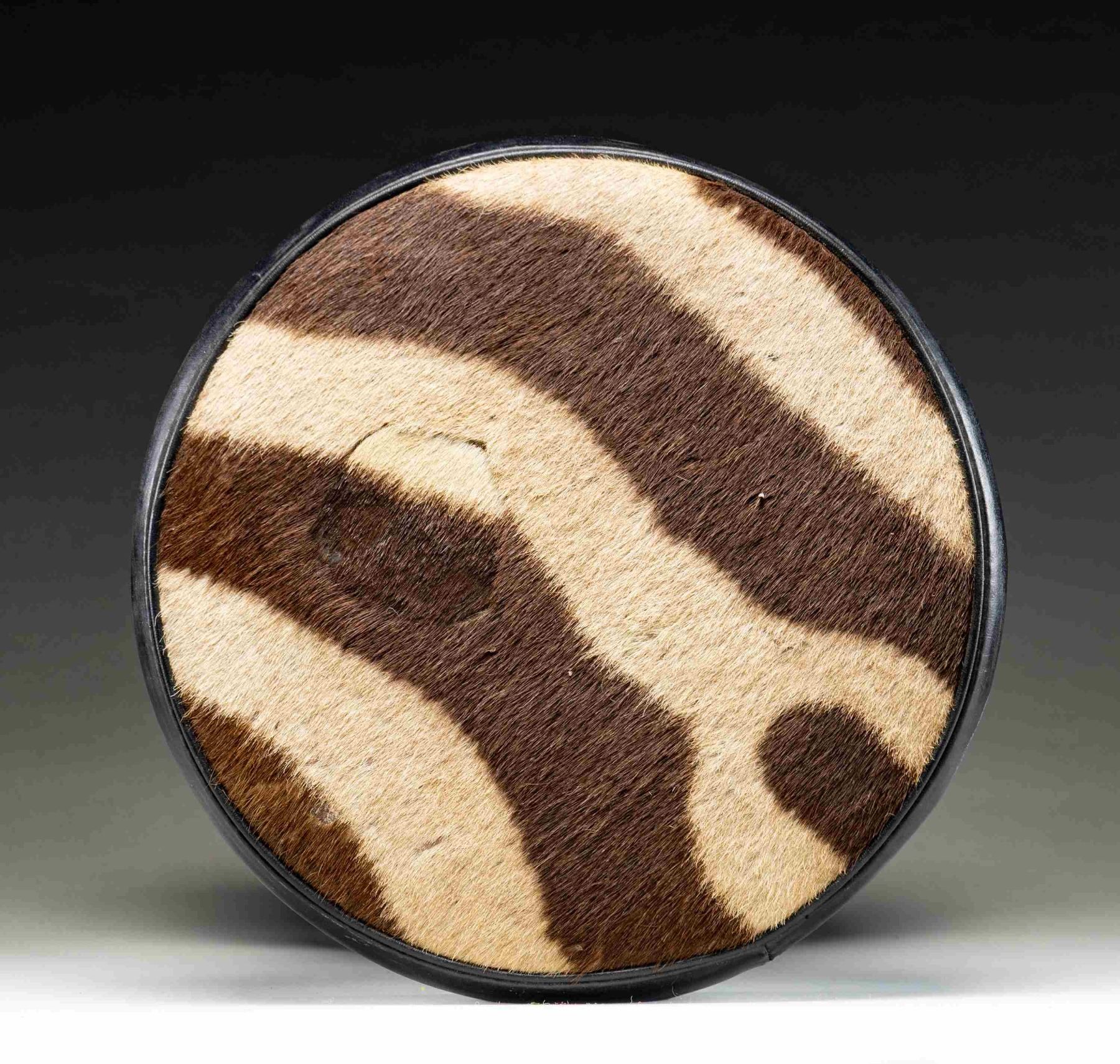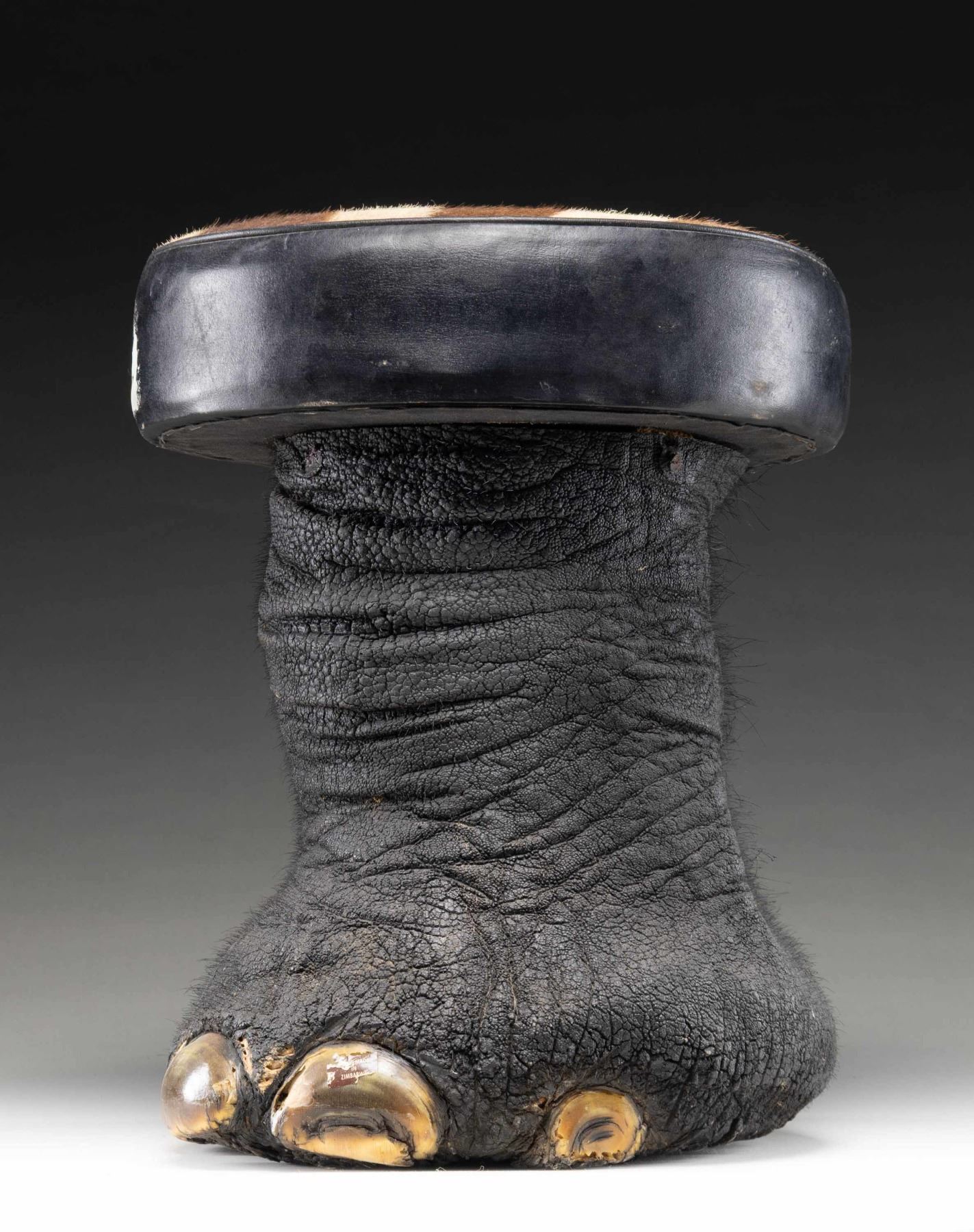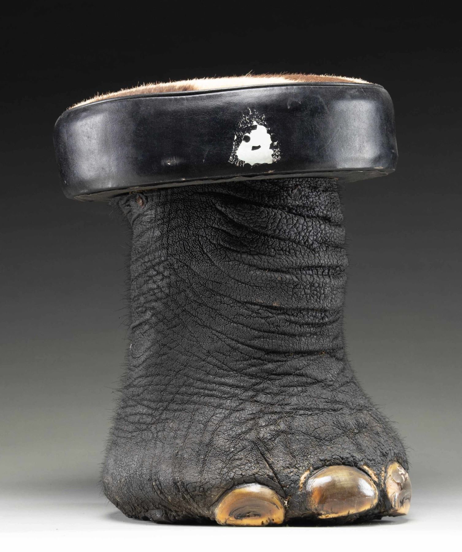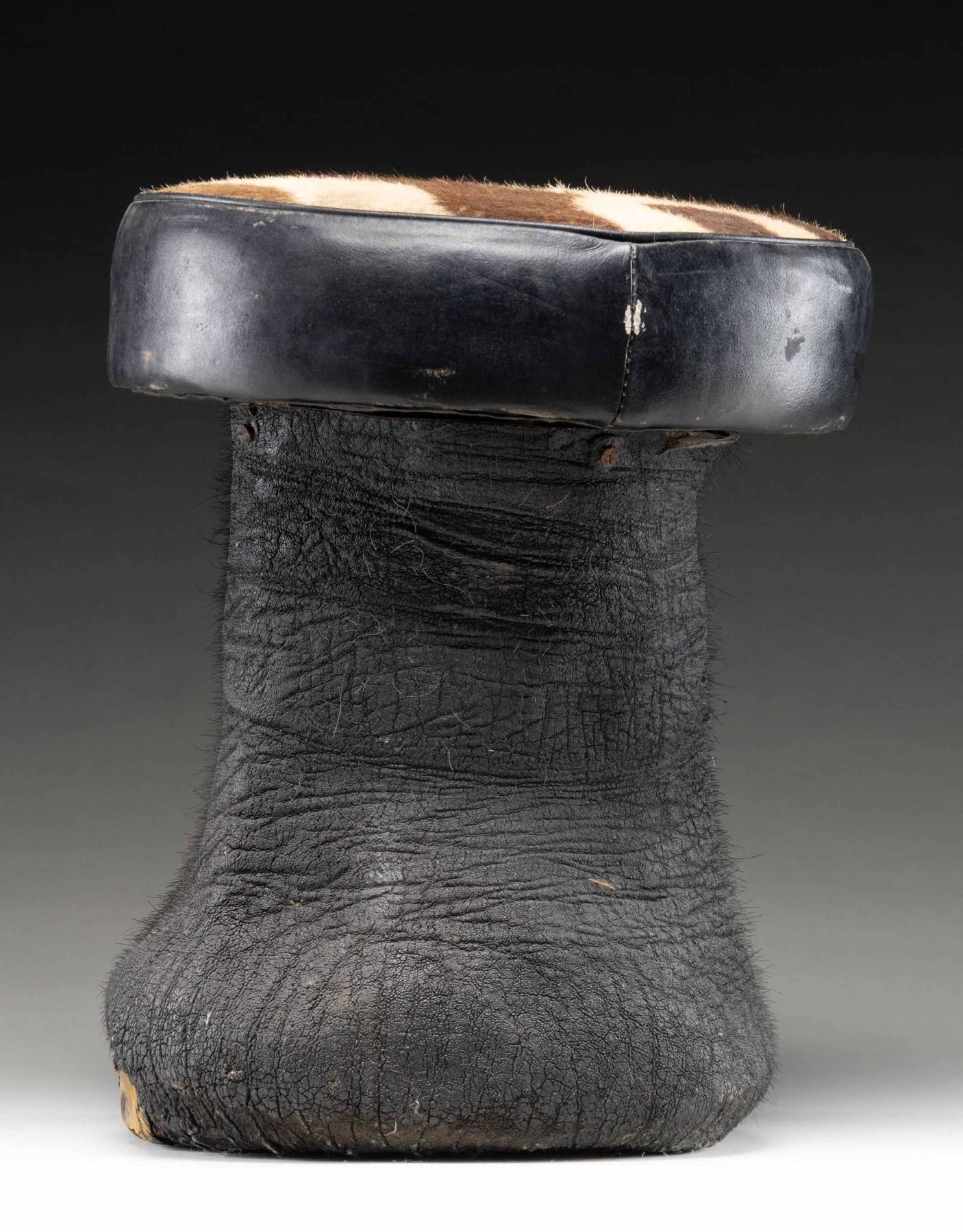 This elephant foot has been made into a sitting stool or foot stool by local craftsmen in India. This example measures approximately 17" in height and approximately 13" in width at the seat. The seat measures approximately 4" in thickness and 42.5" in circumference, with the top covered in stripped brown & white animal hide. The seat is edged in black leather and the foot itself is painted/dyed black. CONDITION: stool has good appearance overall with handling wear. Animal hide shows repaired circular cut. PROVENANCE: from the renowned collection of quality sporting arms from Lewis Drake together with inventory of Lewis Drake Associates. (02-25924-5/MD). NON-GUN. $300-500.