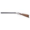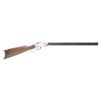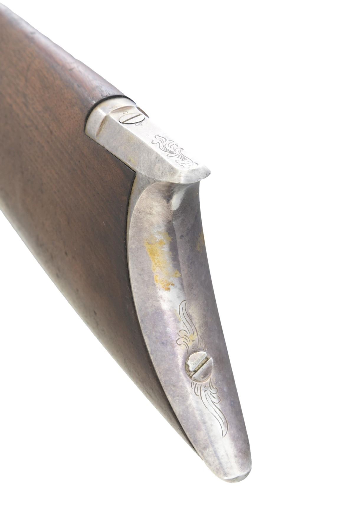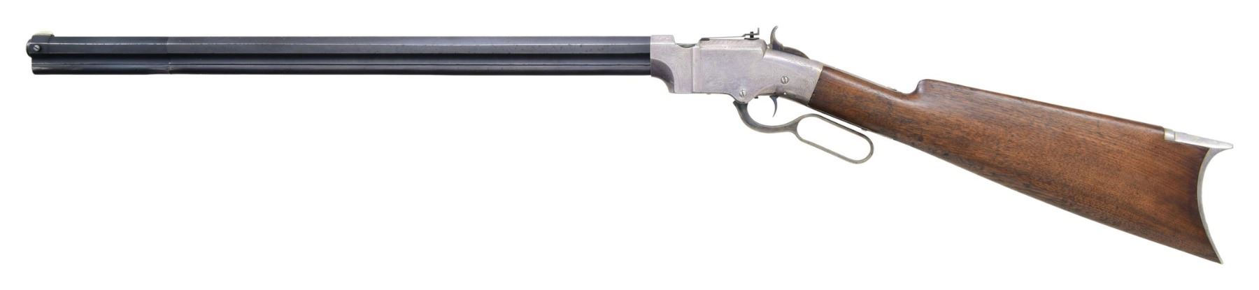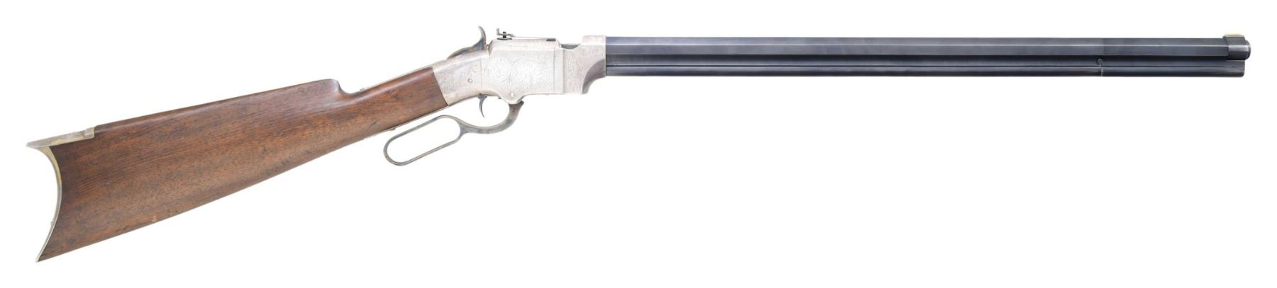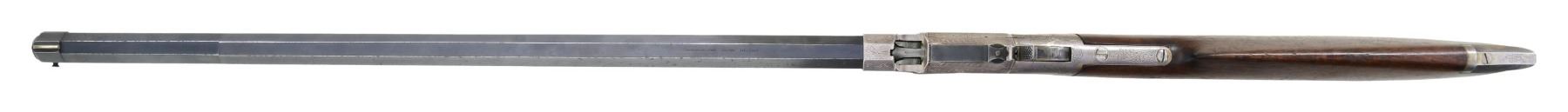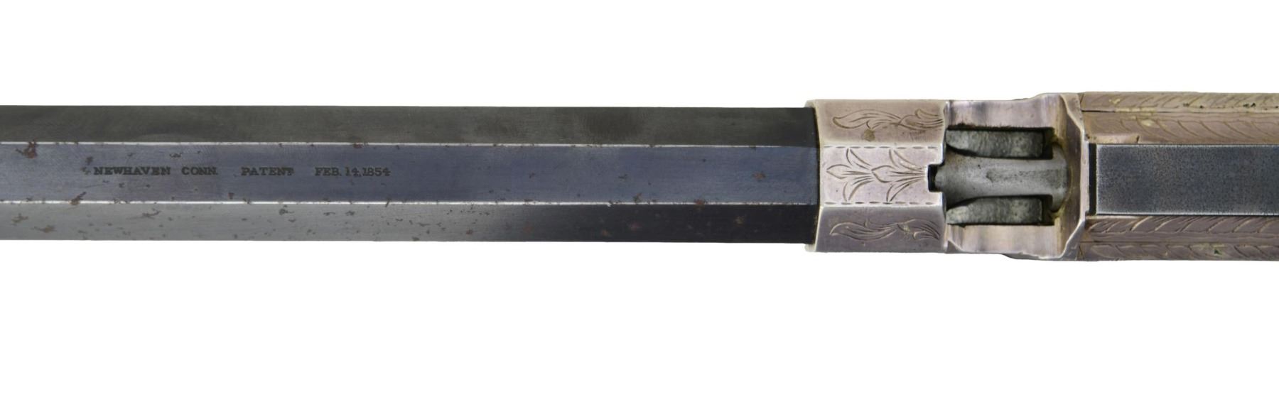 CARBINE. Cal 41. S# 18. Original examples were manufactured in 1857, this facsimile made by unknown craftsman in standard configuration of original, 21" octagonal barrel, full length loading tube, "NEW HAVEN CONN PATENT FEB 14 1854" stamped on top flat, adjustable receiver sight, German silver blade front sight. Silver plated engraved brass frame and butt plate, walnut butt stock. This rifle was meant to fool someone, very well done, S# 18 found on lever, lower tang of frame, buttplate and stock. Matching assembly numbers on sliding sleeve & barrel. CONDITION: very good to fine overall as made, barrel and magazine retain 90% plus blue finish, frame is engraved in factory style and retains most all silver plated finish, mechanically set trigger is touchy and hard to get hammer to hold, magazine follower tab and spring are missing broken, dark rifled bore. (01-26879/JS). ANTIQUE. $2,000-3,000.