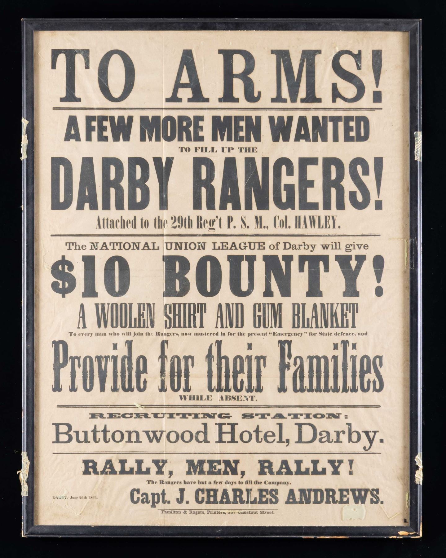 LEE'S ARMY INVADED PENNSYLVANIA & 16TH MASS INF. 1) 24" x 31.5" "TO ARMS, DARBY RANGERS" dated June 26th, 1863 Darby, PA, 29th Reg't PA State Militia, Col. Hawley. Just before the Battle of Gettysburg, there was much apprehension in the state of Pennsylvania with Lee's large army for the first time so deep in Union territory. Col. Joseph W. Hawley had been badly wounded, shot in the neck at Antietam leading his 124th Pennsylvania infantry regiment. The 124th mustered out May 17th 1863, Hawley raised the 29th emergency regiment mostly from his men of the 124th. His 29th PA Militia was headquartered in Chambersburg during the battle of Gettysburg. It is not known how many Darby Rangers joined the unit. After Lee retreated from Gettysburg, the emergency ended and this unit was discharged August 1st 1963. CONDITION: appears very good as framed. 2) 28.5' x 40.5" 16th Mass was a stalwart regiment in the Army of the Potomac, fighting in every major battle, having 245 casualties. This rare double sheet with large text and patriotic eagle illustration might be unique. CONDITION: poor, mounted to cloth backing, paper is brittle, but only small losses of text, several large tears and holes, frame is sound. PROVENANCE: Norm Flayderman family collection. (02-24511, 02-24512/JS). NON-GUN. $1,000-2,000.