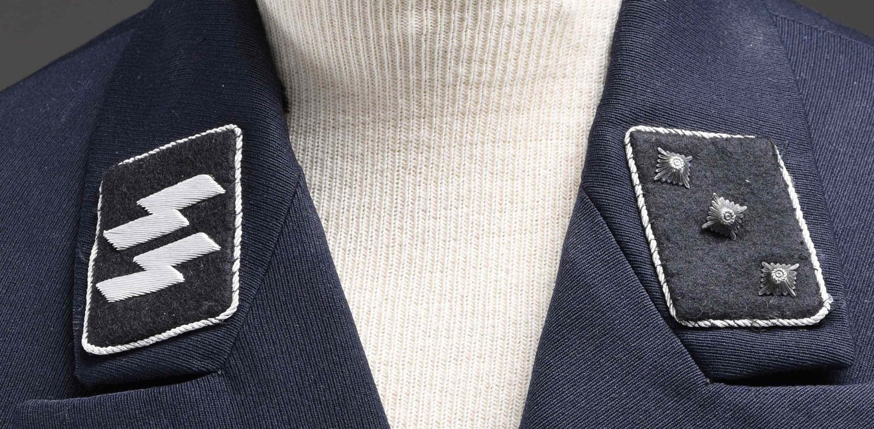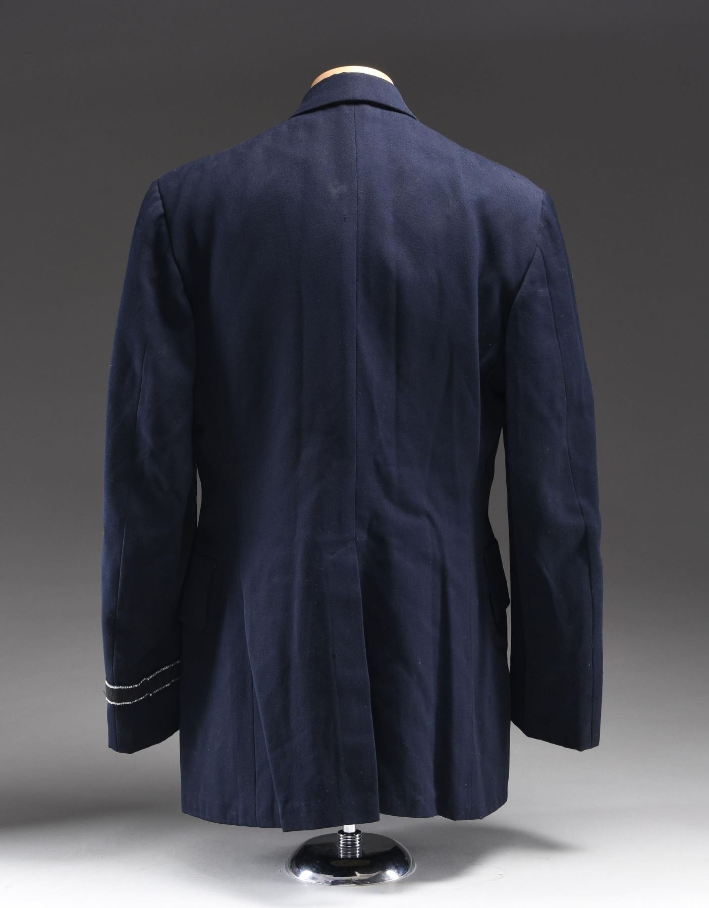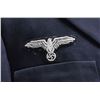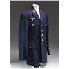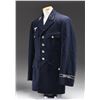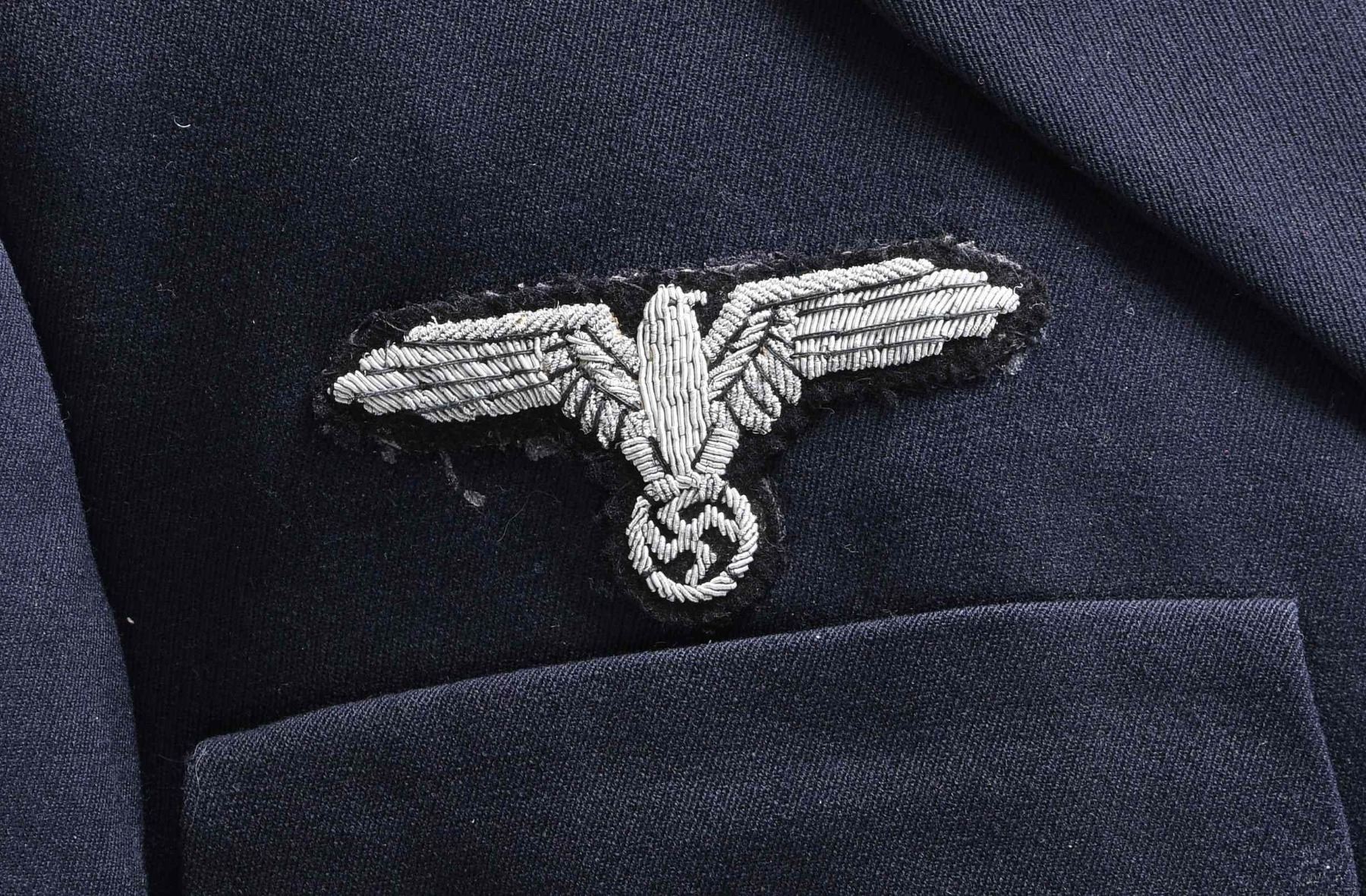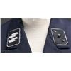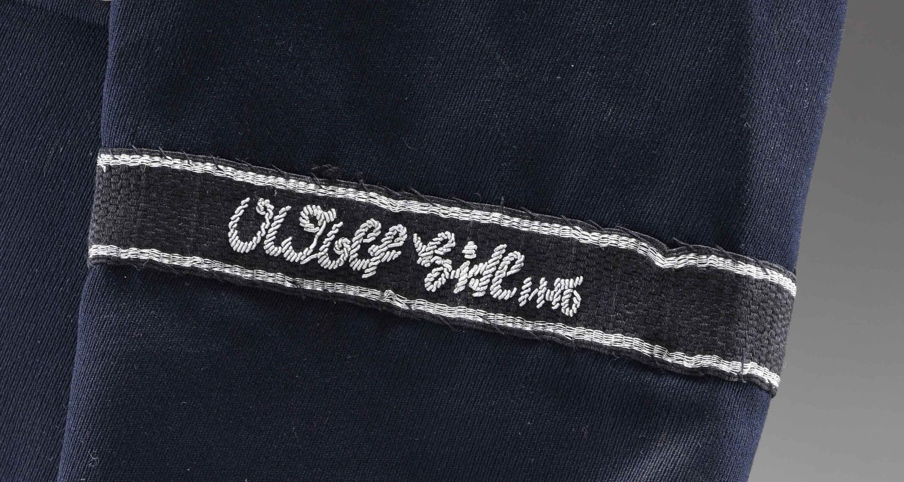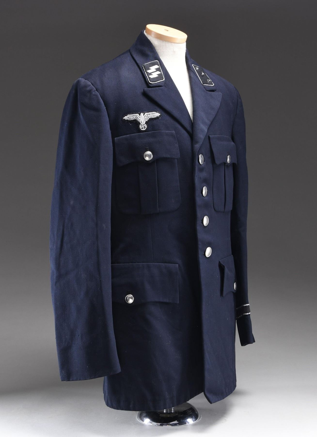 This reproduction tunic was likely made for a WWII reenactor of German Allgemeine SS troops. It is size 39L and is made of a black wool blend. It has a bullion SS eagle above the right breast pocket and a bullion cuff title that reads "Adolf Hitler" on the left sleeve. Plain silver colored buttons with a "SCOVILL" backmark and bullion collar tabs for an SS Untersturmfuhrer. Black satin lining with the initials " J B "on the inside pocket flap. CONDITION: tunic shows light overall wear. (02-23863/BF). $100-250.