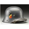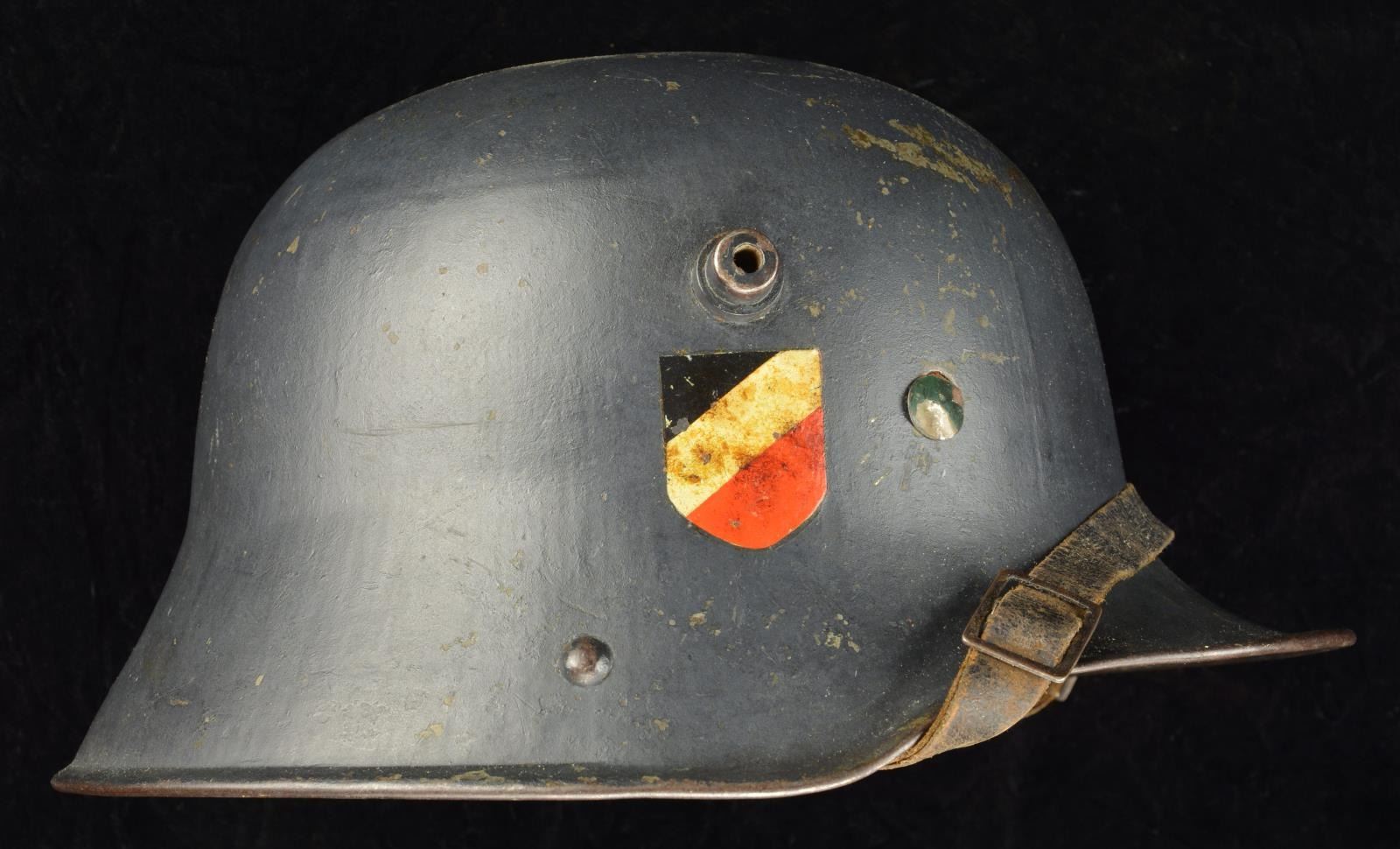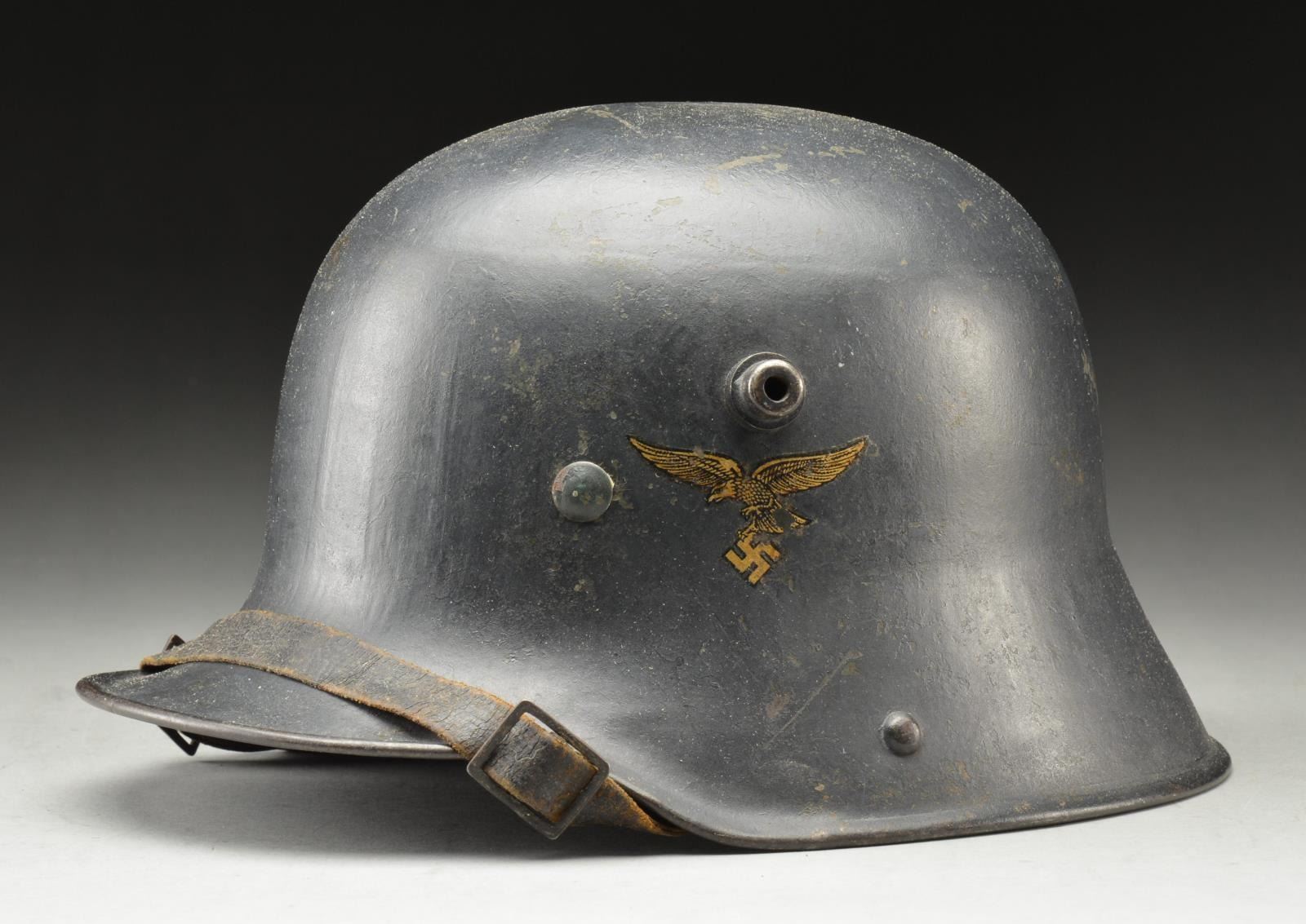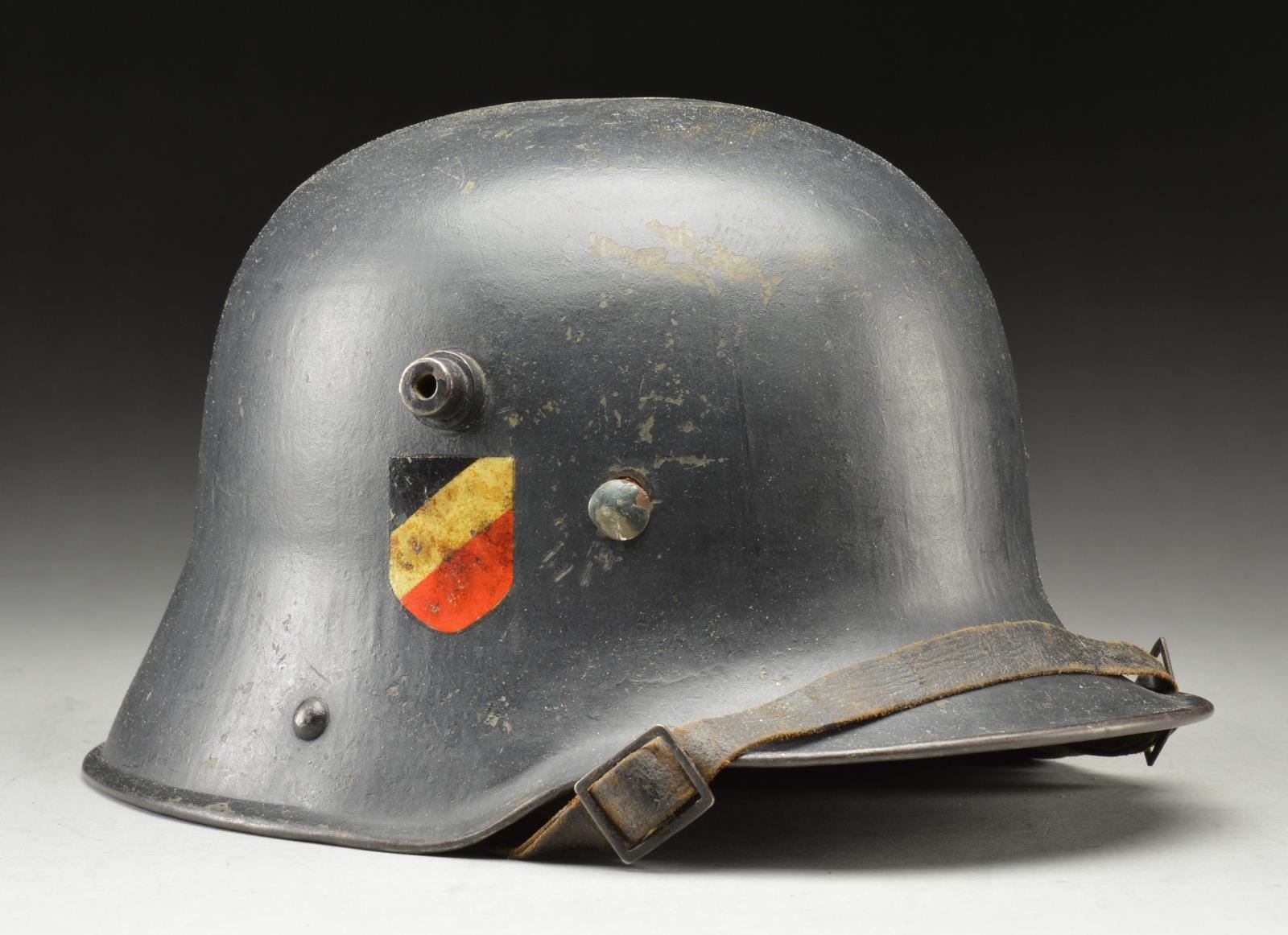A scarce example of an M1916/17 helmet repainted in period & reissued during the early years of WWII. Helmet is painted a deep steel blue w/ a Luftwaffe decal on the left side & National Colors decal on the right. 3 Pad brown leather liner w/ 2 tongues per pad. Black leather chinstrap. Helmet is stamped on the inside left, "BF62". CONDITION: helmet retains approx. 95% of the original repainted finish. Luftwaffe decal is approx. 85%. National Colors decal is approx. 90%. PROVENANCE: The Cullen Smith Estate Collection. (02-17963/BF). $400-800.