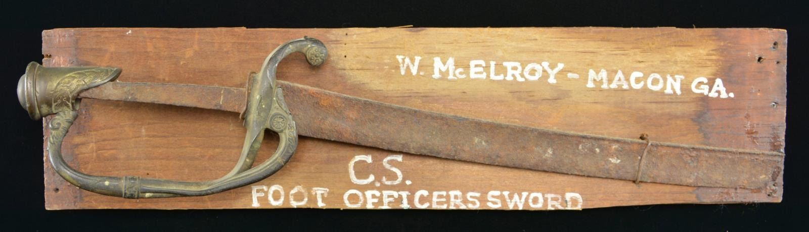 18" x 4.5" Board with "as found" heavily patinaed French pattern antebellum officer's sword, there is a Confederate McElroy, Macon GA etched one pictured in Albaugh as referenced by note on back of board. Unfortunately, the site where this was found is unknown. CONDITION: very good as a relic, heavy iron patina, uncleaned, olive/brown brass patina with traces of gold wash. (02-19328/JS). $300-400.