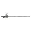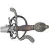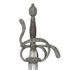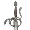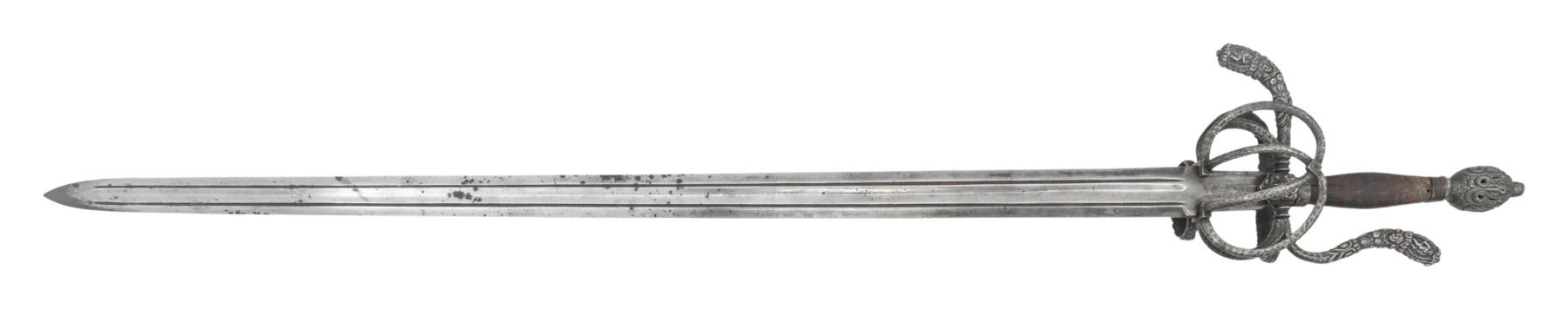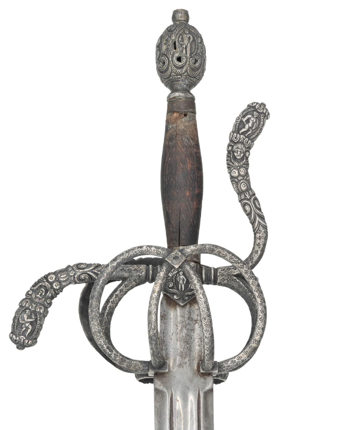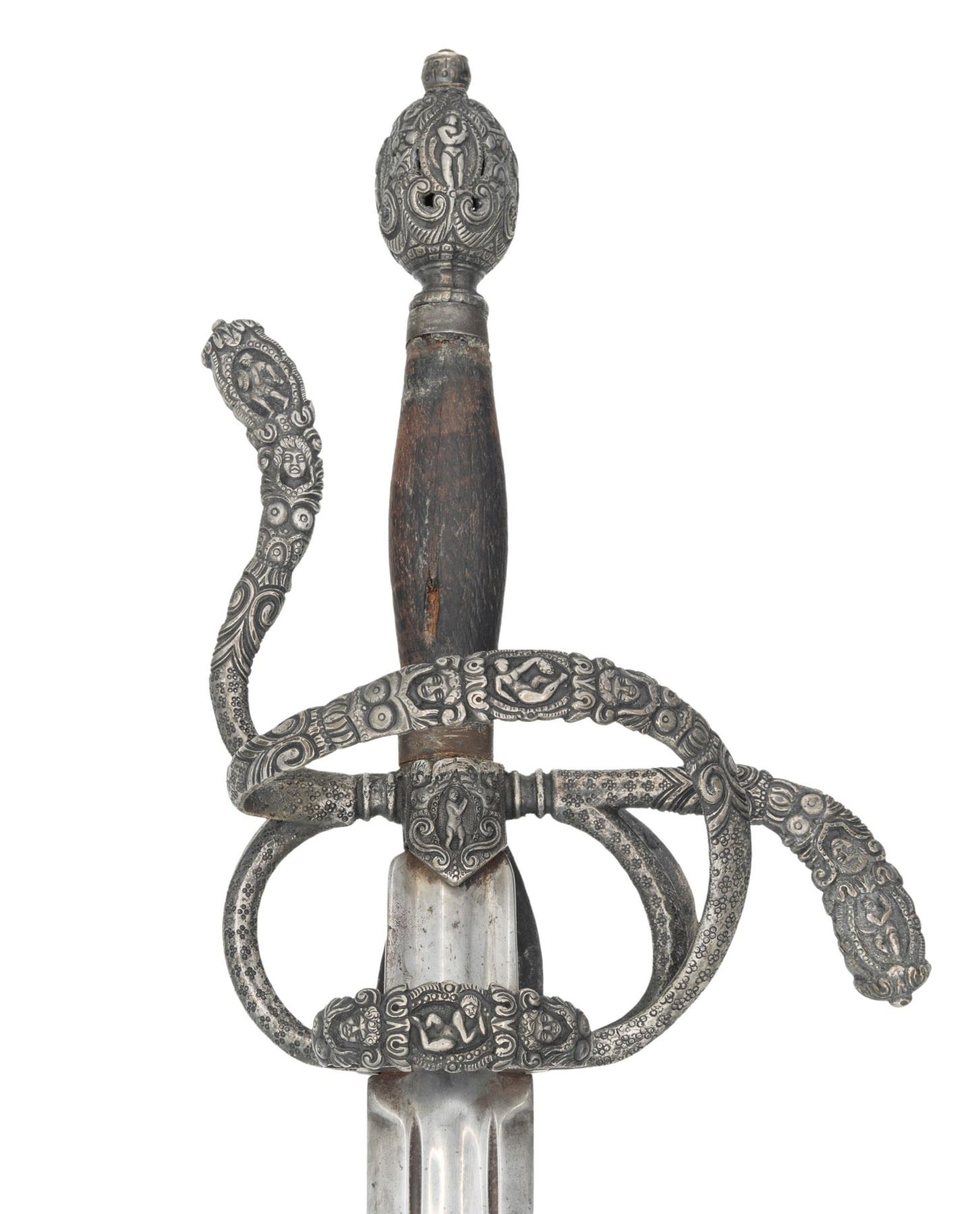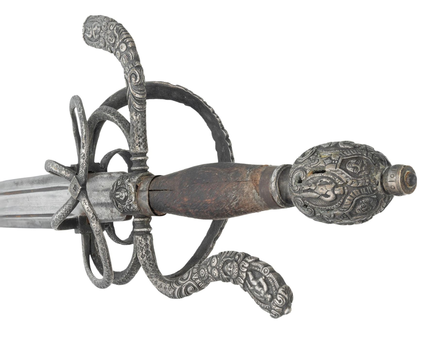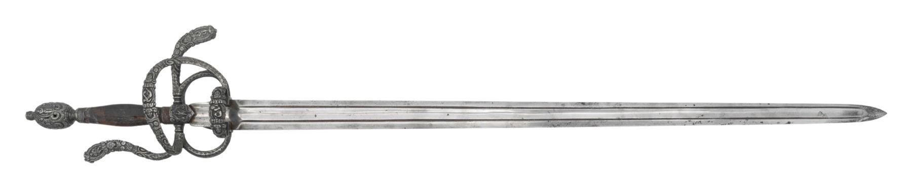 This interesting example is features a relief chiseled swept hilt with scenes consisting of men at arm, damsels, & punch dot floral patterns. The guard consists of a serpentine knuckle bow that attaches to the quillion block with upward sweeping crossguard. A loop guard extends from the quillion block and attaches to the side ring and counter guard. These are attached to the quillion block with arm branches. . It is mounted on a 37" double edged blade with full length large fuller flanked by two secondary fullers. It is capped with a matching egg shaped pommel. The swelled walnut grip is missing its wrap. CONDITION: The unmarked blade has been polished bright with scattered pitting. Grips have scattered gouges. There is a little wiggle in the pommel. PROVENANCE: Estate Collection of Nicholas Apergis. (02-24684/ZAL) $1200-1800