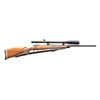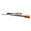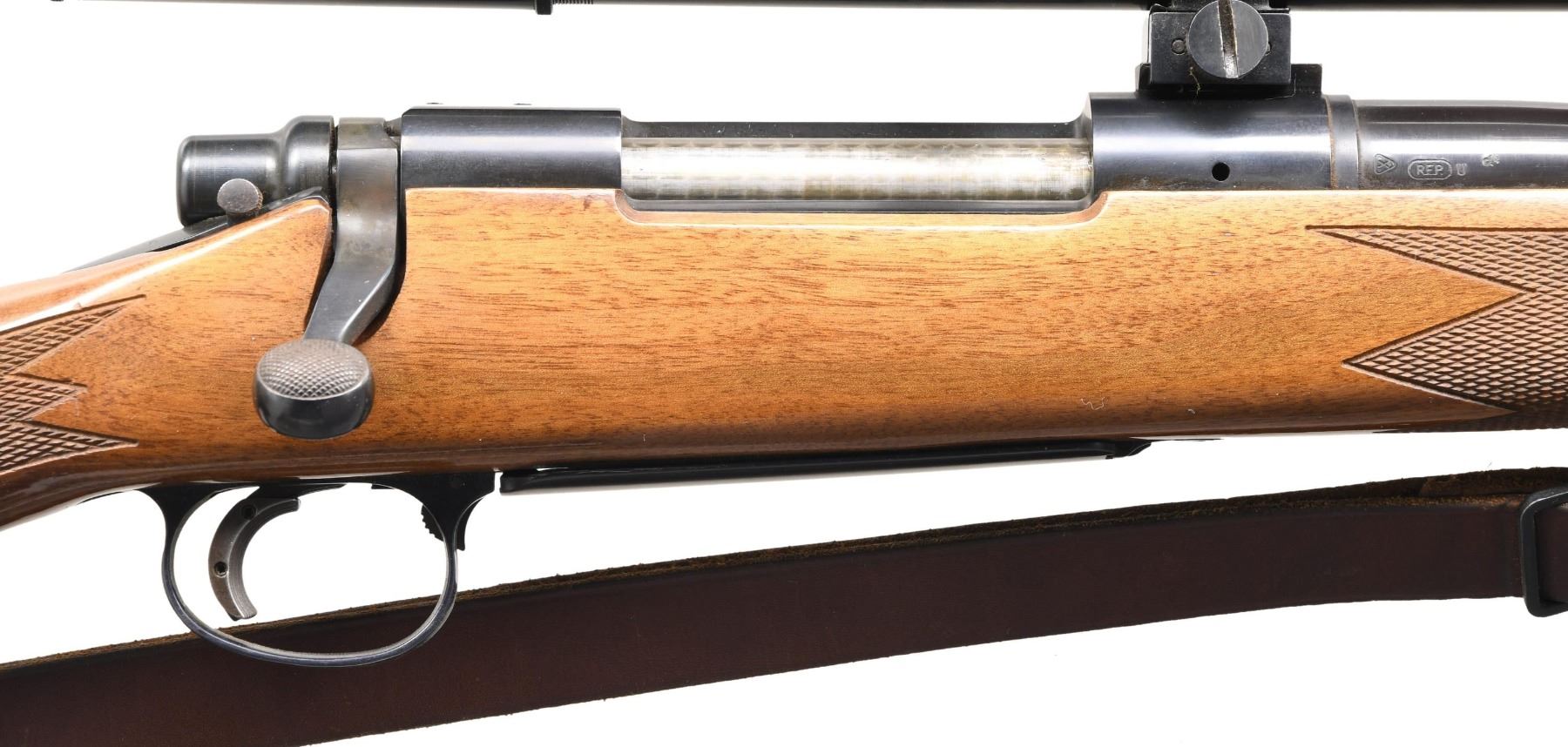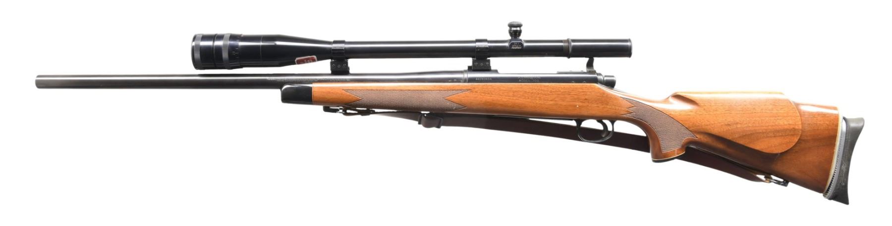 Cal. 25-06. S# A6283658. Bbl. 24" heavy w/o sights. 2 lug action w/ jeweled bolt body, 2 position safety & hinged floorplate. Trigger has added wide shoe. Redfield 24x target scope w/ AO, target turrets, gloss finish & standard crosshairs on target scope blocks. Monte Carlo cheekpiece walnut stock w/ cut checkering. Black forearm tip & grip cap w/ white line spacers. Aftermarket Morgan adj. pad. Leather sling on QD swivels. CONDITION: 98% blue. Stock finish shows scattered small marks. Very good bore. Scope has bright optics. (24-4358/DS). MODERN. $1,200-1,600.