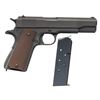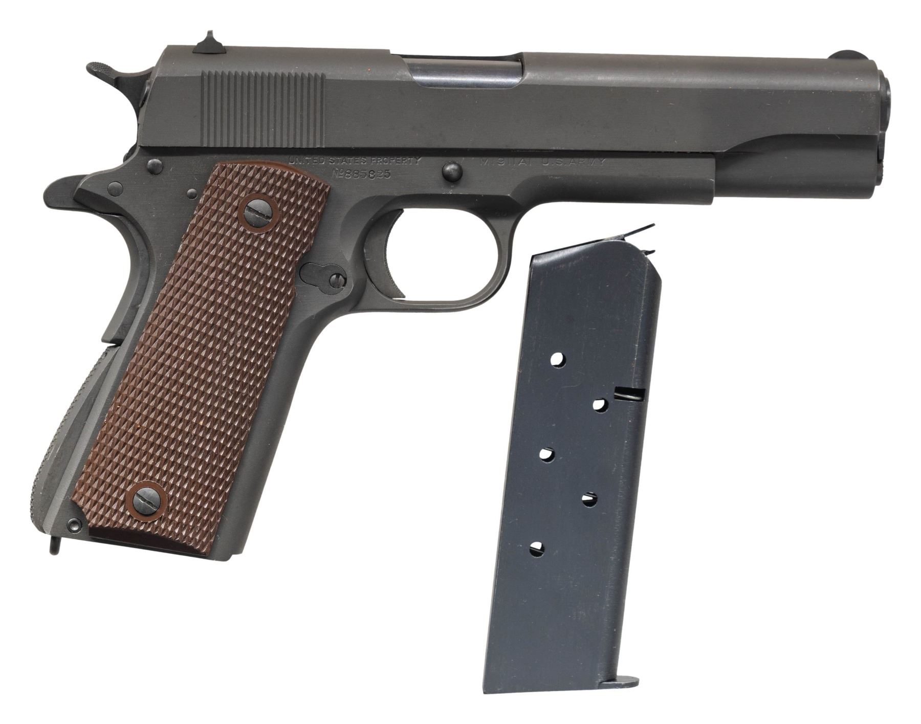 PISTOL. Cal. 45 ACP. S# 885825. Mfg. 1943 within S# range 856,101-958,100. Has all correct parts including Type 6 Colt 5" barrel, matching numbered slide having Type B front sight & Type B U notch rear sight along with Coltwood grips. MAGS: 1 excellent Scovill "C-S" mag. UNATTACHED ACCESSORIES: WWII parkerized Stanley screwdriver & post WWII "J.A.M. 5564102" cleaning rod. CONDITION: pistol has over 95% original parkerized finish showing light scratches on left side of frame in recess cutout & a few small light scratches under mag. button. Slide shows a few small light marks behind front sight & small light scratches left side slide around rampant Colt. Grips are excellent with a few small light marks on bottoms. Barrel has over 90% original blue finish with light cycling wear. Bright bore with very good rifling. (25-6134/MD). CURIO. $3,500-5,000.
