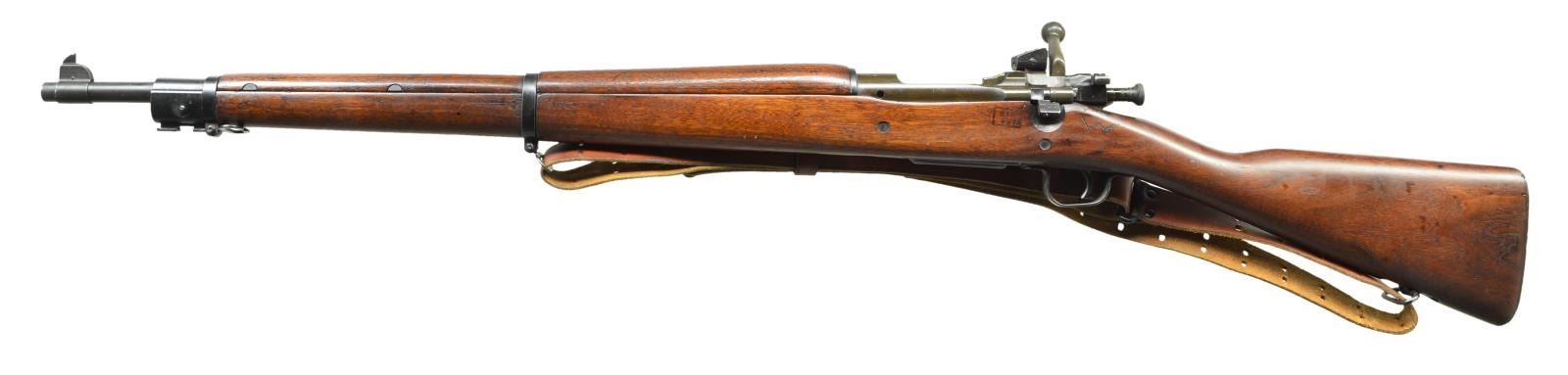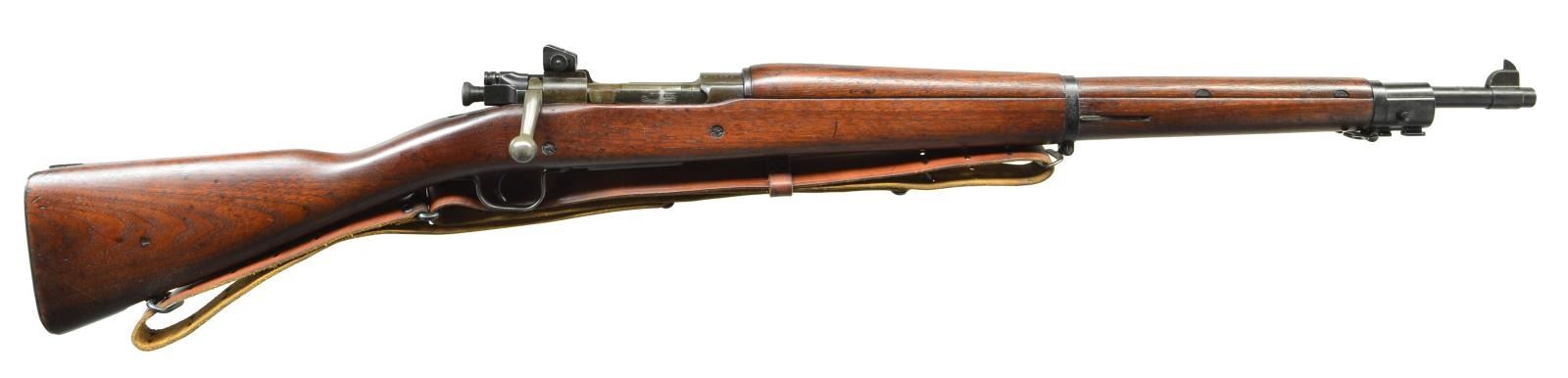 Cal. 30-06. S# 4019837. Bbl. 24" marked "RA" over flaming bomb w/ "7-43" date. Band fastened blade front sight w/ receiver mounted rear sight. Stamped floorplate & triggerguard. Parkerized finish. Type S walnut stock w/ handguard. Checkered trapdoor buttplate. Leather military sling on original swivels. Left side & toeline of stock have indistinguishable markings. CONDITION: very good rearsenaled condition retaining 80% parkerized finish. Refinished wood shows scattered scratches, dents & marks. Bright bore w/ strong rifling. (22-523/DS). CURIO. $500-700.