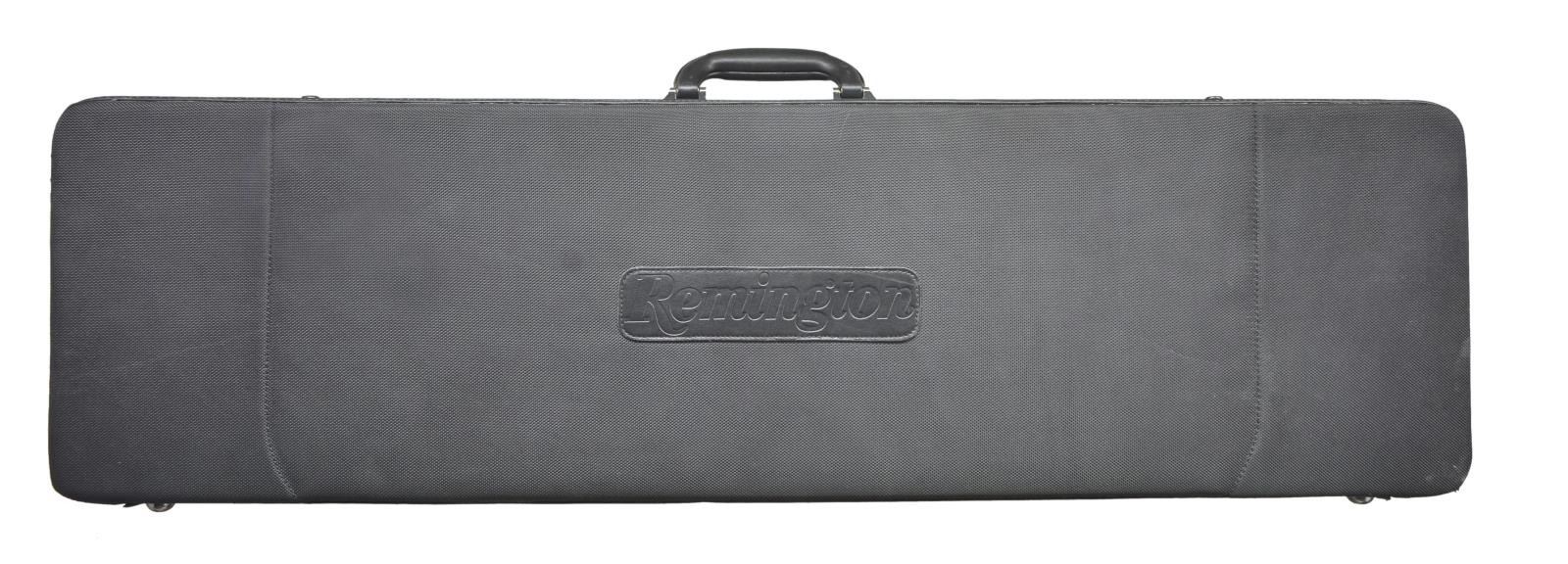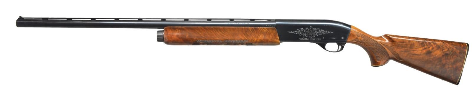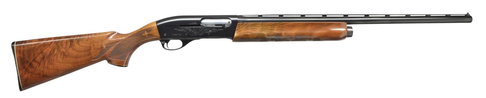 Cal. 12 Ga., 2 3/4". S# 480325V. Bbl. 25 1/2" VR w/ white target front sight & steel mid bead. Fixed Skeet choke. Blue action w/ scroll engraving. Walnut forearm & capped pistol grip stock of gloss finished fancy walnut w/ pressed checkering. LOP: 14" over original buttplate & white line spacer. UNATTACHED ACCESSORIES: black Rem. marked luggage case w/ black fitted interior & carry strap. CONDITION: 98% original blue. Wood shows scattered light scratches & marks. Very good bright bore. (21-262/DS). MODERN. $500-800.