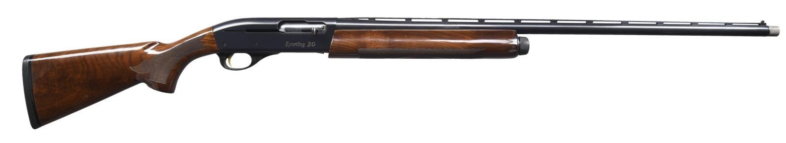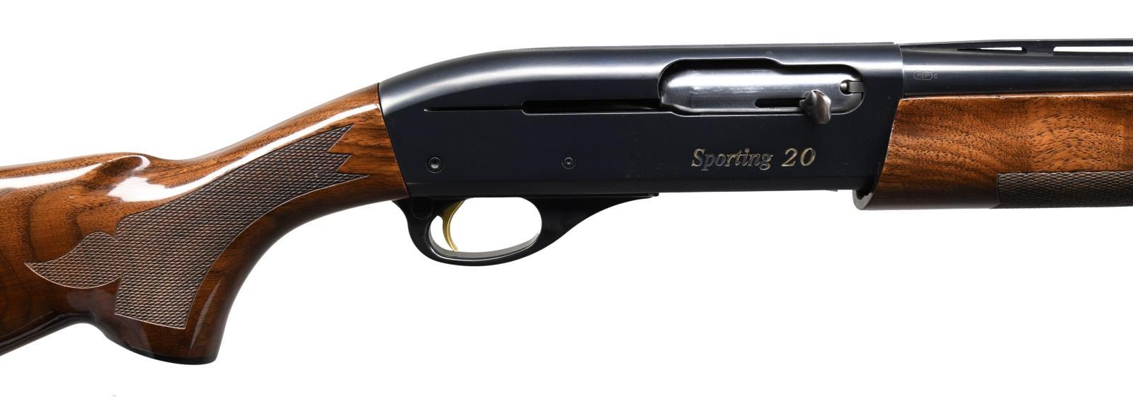 Cal. 20 ga. 2 3/4". S# R214440K. Bbl. 28" vent rib with Rem chokes. Extended skeet tube is included. White target front sight with steel mid bead. Action has gold-filled "Sporting 20" markings on the right side of the receiver. Gold-finished trigger. Gloss-finished walnut stock & forearm with cut checkering. LOP: shortened to 14" over the aftermarket declerator pad. CONDITION: 95% lightly worn blue, showing small marks & scratches. Original wood finish shows small scratches & marks. Very good bore. (23-7020/DS). MODERN. $800-1,200.