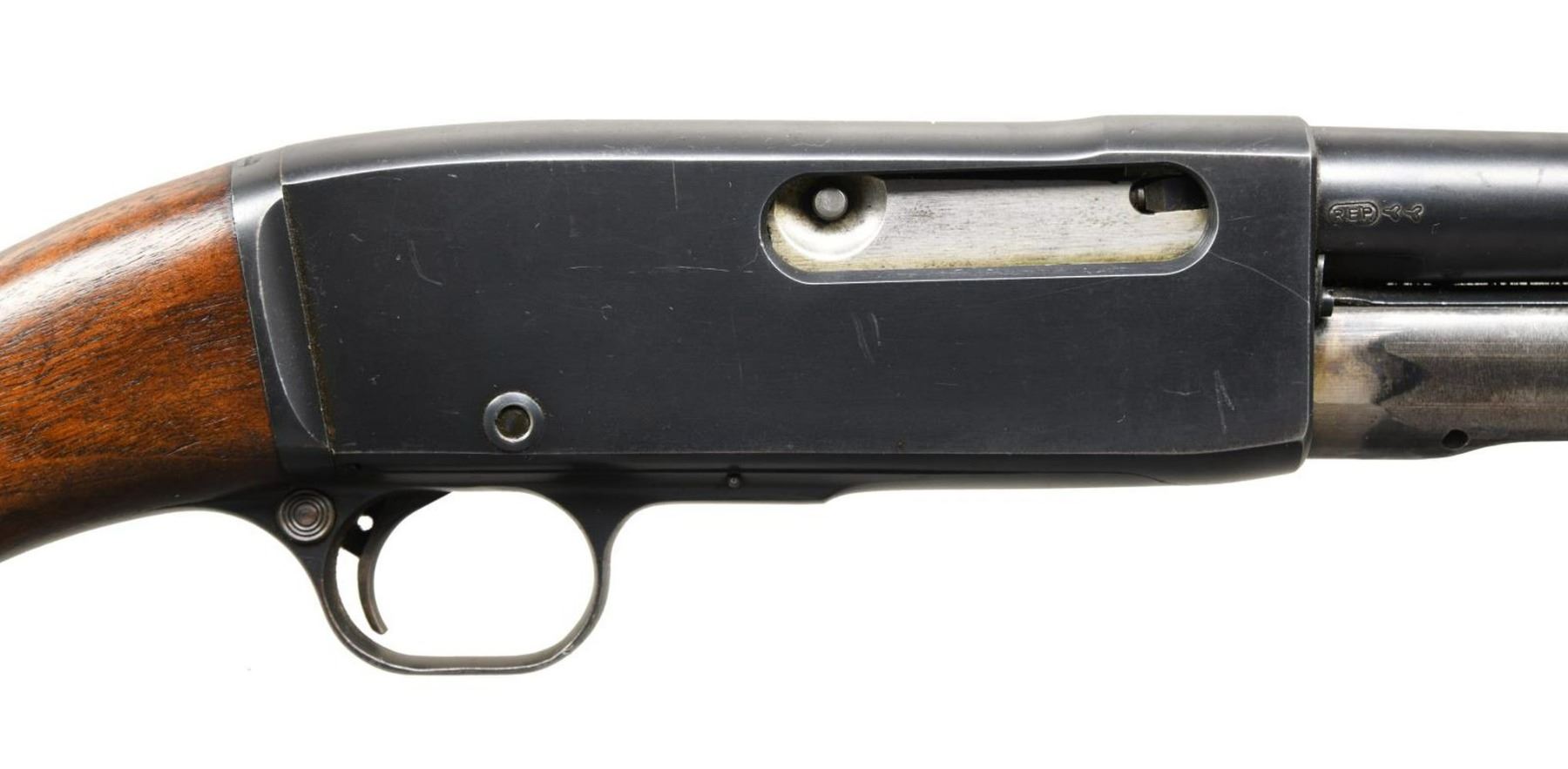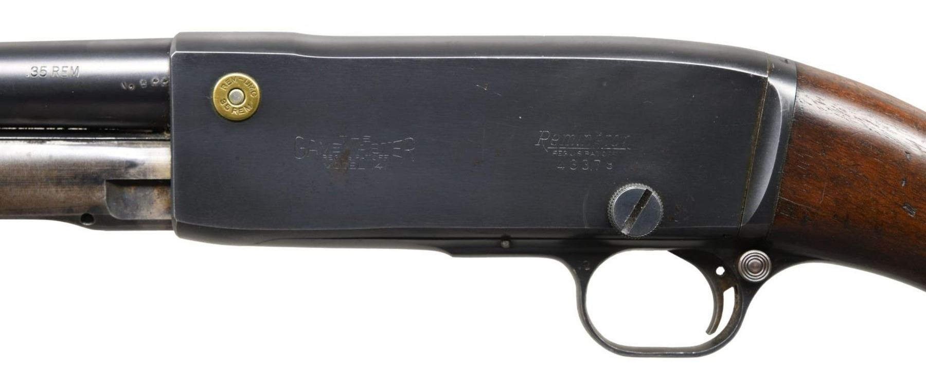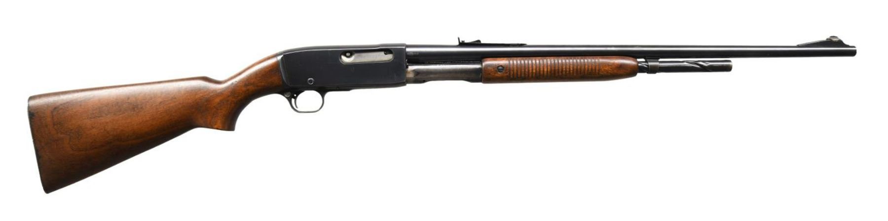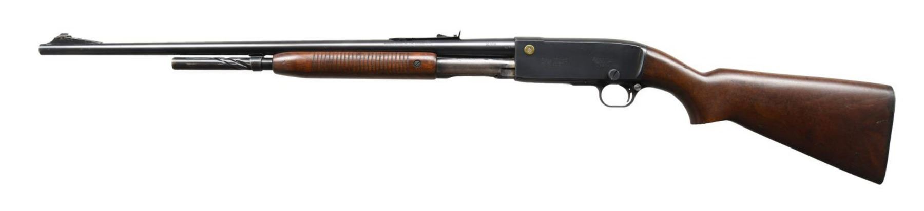 Cal. 35 Rem. S# 43378. Bbl. 24". Ramped bead front sight. Adjustable sporting rear sight. 2/3 length mag. Pistol grip, walnut stock. Grooved forend. CONDITION: stock set shows some scattered dings & handling wear. Metal retains 80% original blue w/ scattered flaking to brown, operational wear, & light oxidation. Very good bore w/ some light frosting. (23-2367/MJC). CURIO. $400-600.