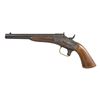 MODEL ROLLING BLOCK PISTOL. Cal. 50. S# 1605 (found on bottom of barrel). Rare pistol has standard 1865 features with addition of a brass trigger guard. Trigger guard bow is stamped "PATTERN GUARD / ORDER, JANy 28, 1870. / ORD DEPT. U.S.N.Y.W. / F.M.R." It is known that many of the Model 1865 pistols were converted to Model 1867 configuration in the early 1870's. The 1867 had a standard trigger and trigger guard. This appears to be a prototype or experimental model that facilitated that transition. Bbl. 8 1/2" round with blade sight. Breech end of barrel is marked with Navy anchor. Rolling block action features standard Model 1865 spur trigger. Left side of frame is marked "REMINGTON'S, ILION N.Y. U.S.A. / PAT. MAY 3d NOVEMBER 15th 1866 APRIL 17th 1866". Right side of receiver has inspectors markings "P / F.C.W." Walnut forearm and 1 piece walnut grip. Left panel shows a weak "F.C.W." cartouche. Although approx. 6,500 Model 1865's were produced, they are scarce today due to conversion. CONDITION: metal has faded to a dark brown patina with light surface corrosion. Wood shows wear and handling marks. Lightly pitted bore retain strong rifling. (01-21448/DS). ANTIQUE. $1,500-2,500.