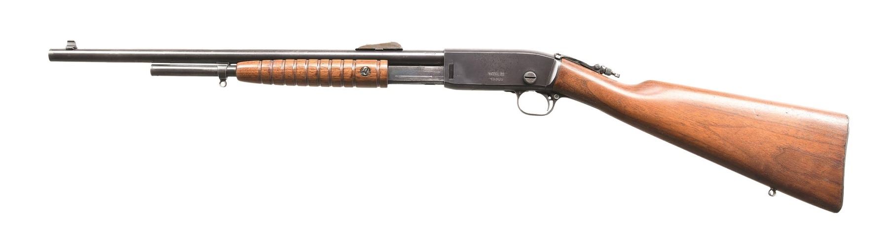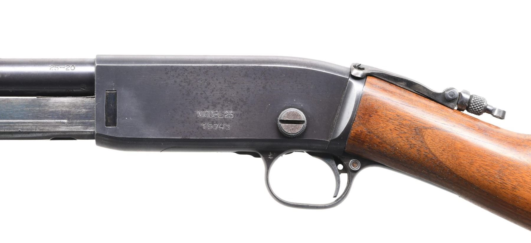 Cal. 25-20. S# 19743. Bbl. 17 3/4" round. Lyman replacement white bead front sight w/ protected V notch rear sight & Lyman tang sight. Grooved forearm & straight grip walnut stock w/ grooved steel buttplate. Toeline of stock & mag. band have sling eyes. Mfg. 1928. CONDITION: 80% lightly faded blue showing spots of freckling. Refinished wood shows scattered marks. Bright near excellent bore. PROVENANCE: The estate collection of Don "Duck" Combs. (24-2472/DS). CURIO. $1,600-2,200.