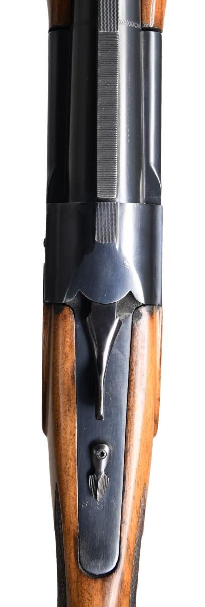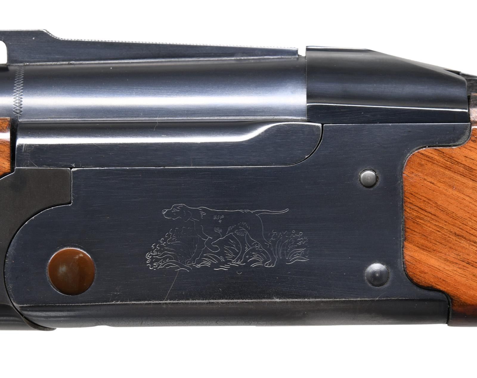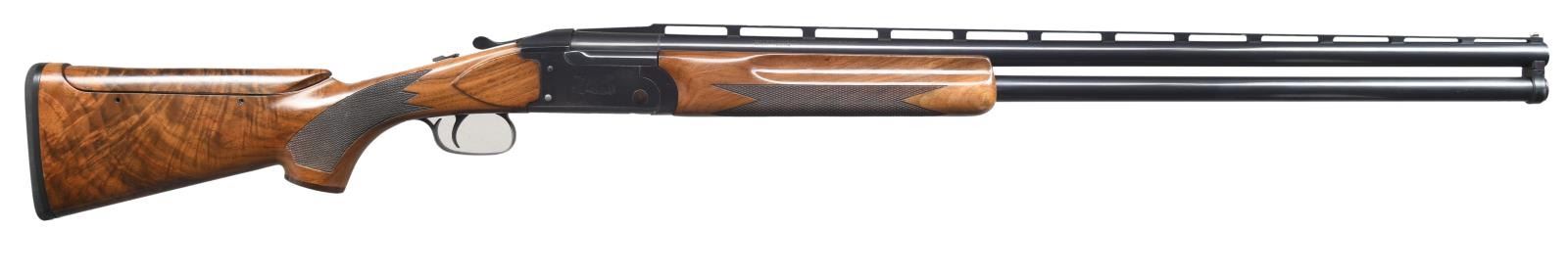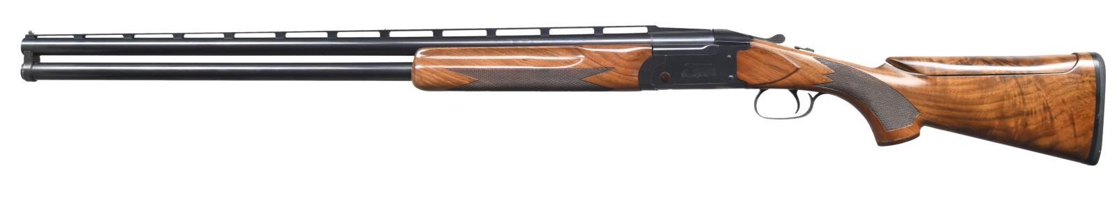 Cal. 12 ga. 2 3/4". S# OU.7396. Bbl. 30" vent rib. Aftermarket Briley choke tubes. Two tubes included. White target front sight with steel mid-bead. Single-selective trigger, selective ejectors. Finger groove forearm and plastic-capped pistol grip stock of fancy walnut with cut checkering. Aftermarket adj. comb. LOP: shortened to 13 1/2" over a thin black Decelerator pad. CONDITION: over 90% showing carry & edge wear. Forearm has a lightly worn original finish, showing handling marks. Refinished stock has a small crack on the left side of the trigger guard tang. Very good bores. Top lever sits just left of center. (23-7089/DS). MODERN. $900-1,300.