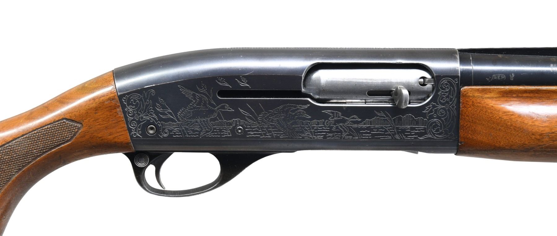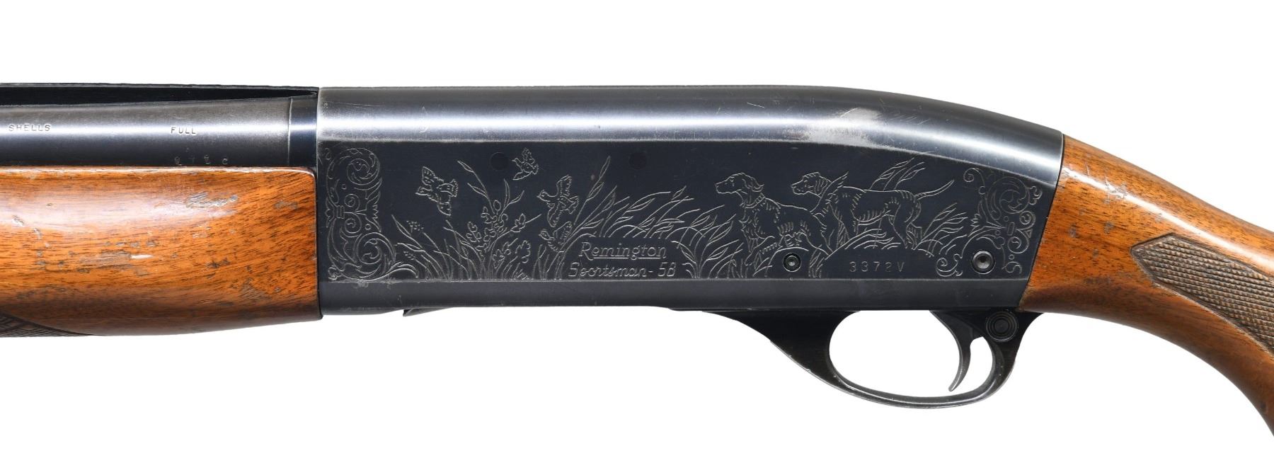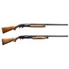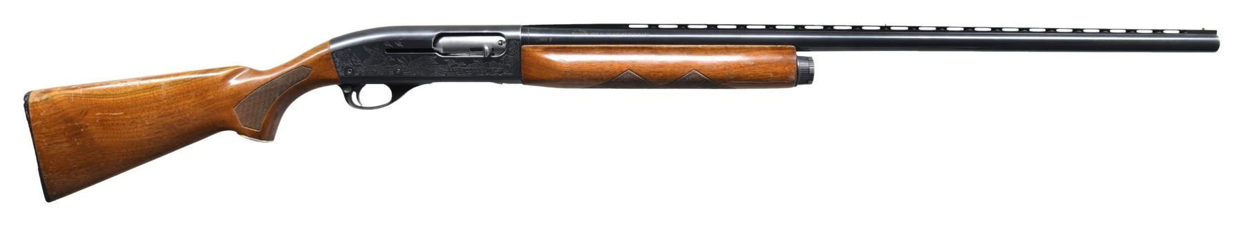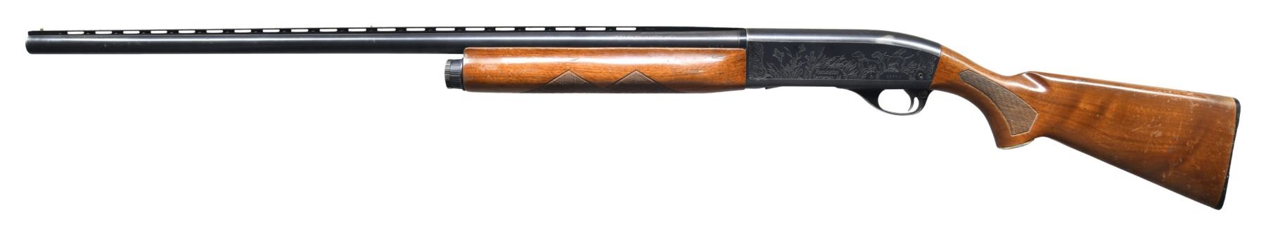 1) REMINGTON SPORTSMAN 58 AUTO-LOADING SHOTGUN. Cal. 12 ga. 2 3/4". S# 3372V. Bbl. 30" w/ aftermarket Polychoke aluminum vent rib. Brass front & mid beads. Choke is opened to Mod, original marking is Full. Gas operated action w/ light & heavy load setting on mag. cap. Receiver has hunting scene ornamentation. Walnut forearm & stock w/ impressed checkering, aluminum grip cap & original buttplate. CONDITION: 70% blue showing carry wear & handling marks. Wood has worn finish w/ numerous dents, scratches & marks. Very good bore. Slide bar appears to be bent, preventing action from closing properly. (24-3217/DS). CURIO. 2) MARLIN MODEL 120 MAGNUM PUMP SHOTGUN. Cal. 12 ga. 2 3/4 & 3". S# A14961. Bbl. 30" vent rib w/ fixed full choke. Brass front & mid bead. Walnut beavertail forearm & capped pistol grip stock w/ impressed checkering. LOP: 14" over an aftermarket solid brown Decelerator pad. CONDITION: 97% blue showing slide & carry wear. Very good wood finish showing a few small marks. Very good bright bore. (24-3502/DS). MODERN. $500-700.