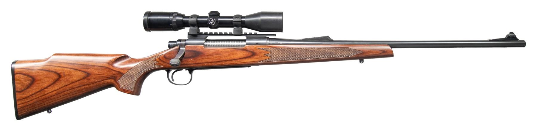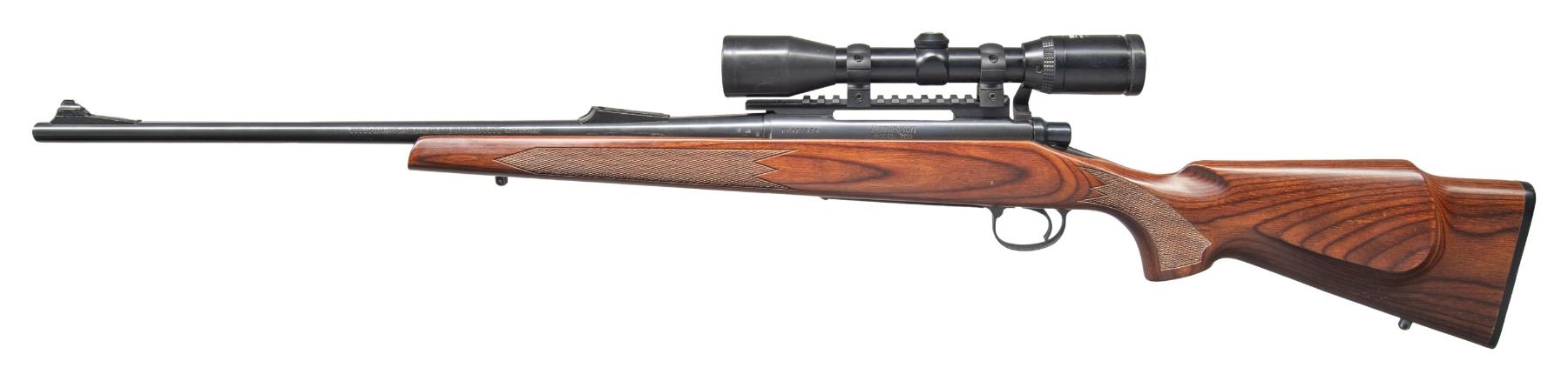Cal. 30-06. S# C6727974. Bbl. 22". Ramped white bead front sight. No rear iron sight present. Receiver mounted Zeiss Diavari-C 3-9x36 scope. Scope has covers, duplex crosshair reticle & very good optics. Blued & anodized finishes. Laminated stock with right handed cheekpiece & bottom mounted sling studs. CONDITION: stock shows a few light handling marks. Metal retains 98% original bluing & anodizing with some handling marks & light edge wear. Action functions properly when hand cycled. Near excellent bore. PROVENANCE: Estate Collection of John "Jack" Dhooghe. (25-5505/MJC). MODERN. $700-1,000.