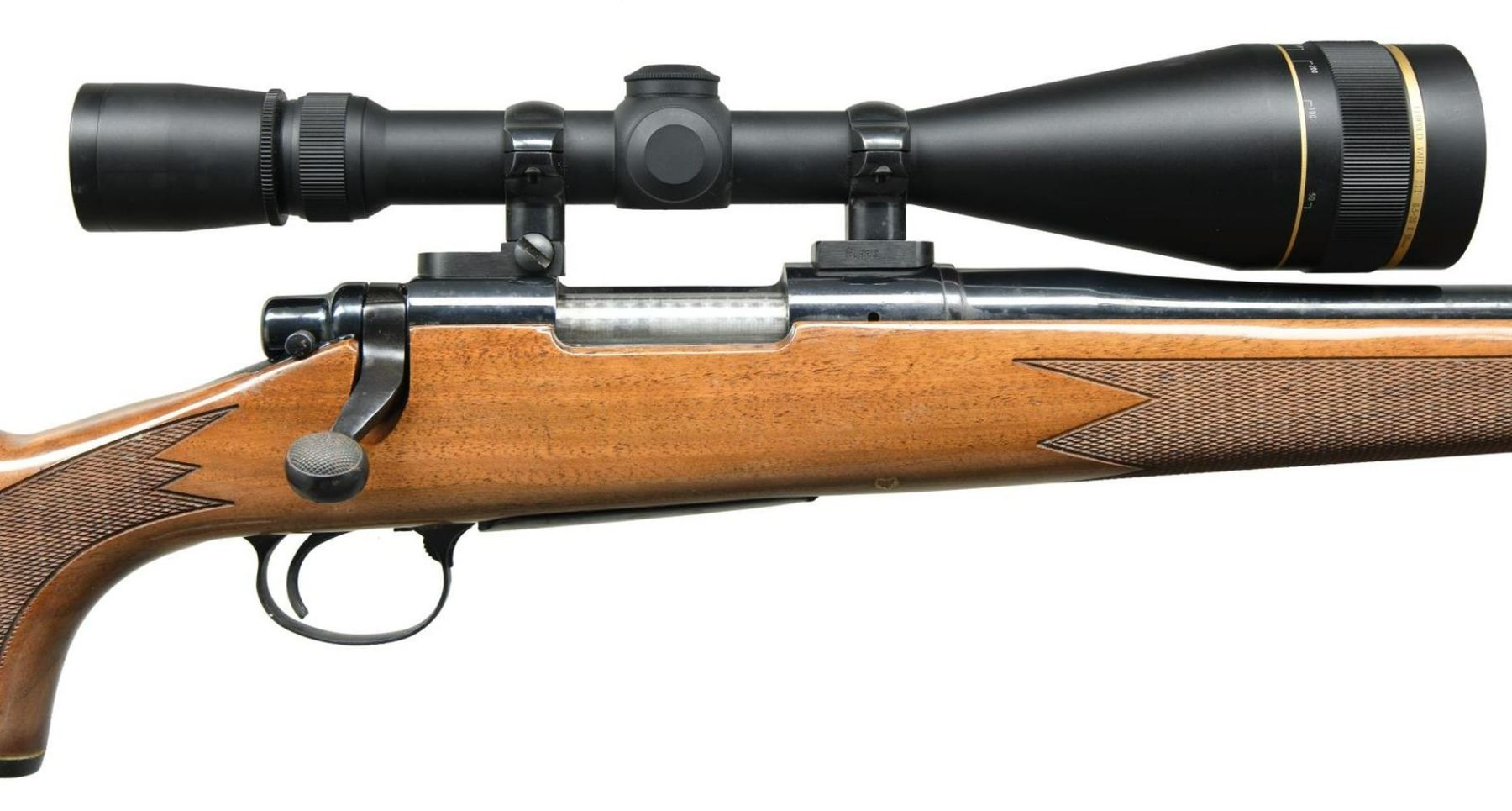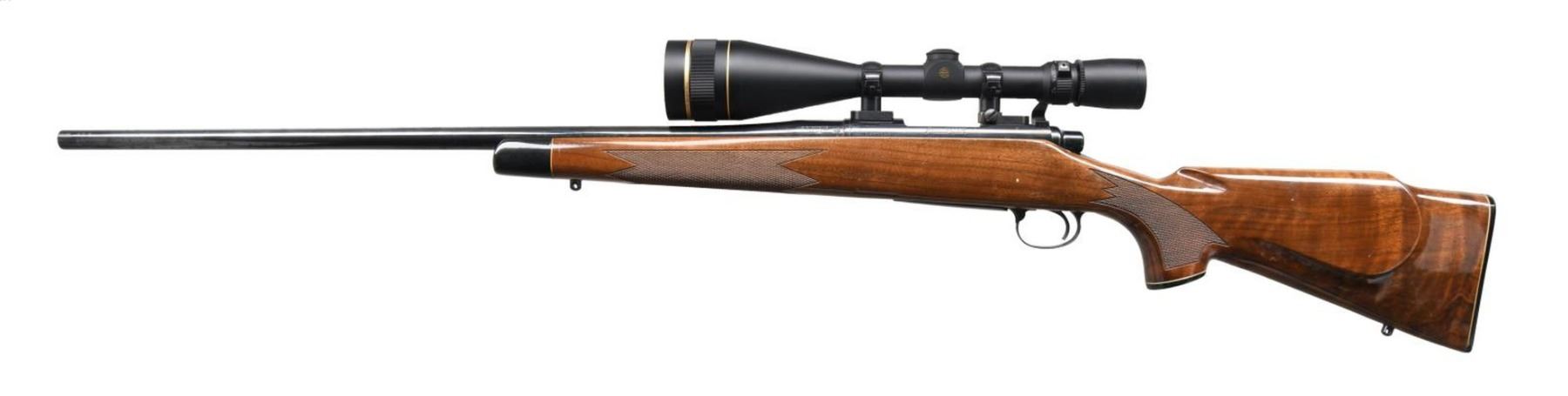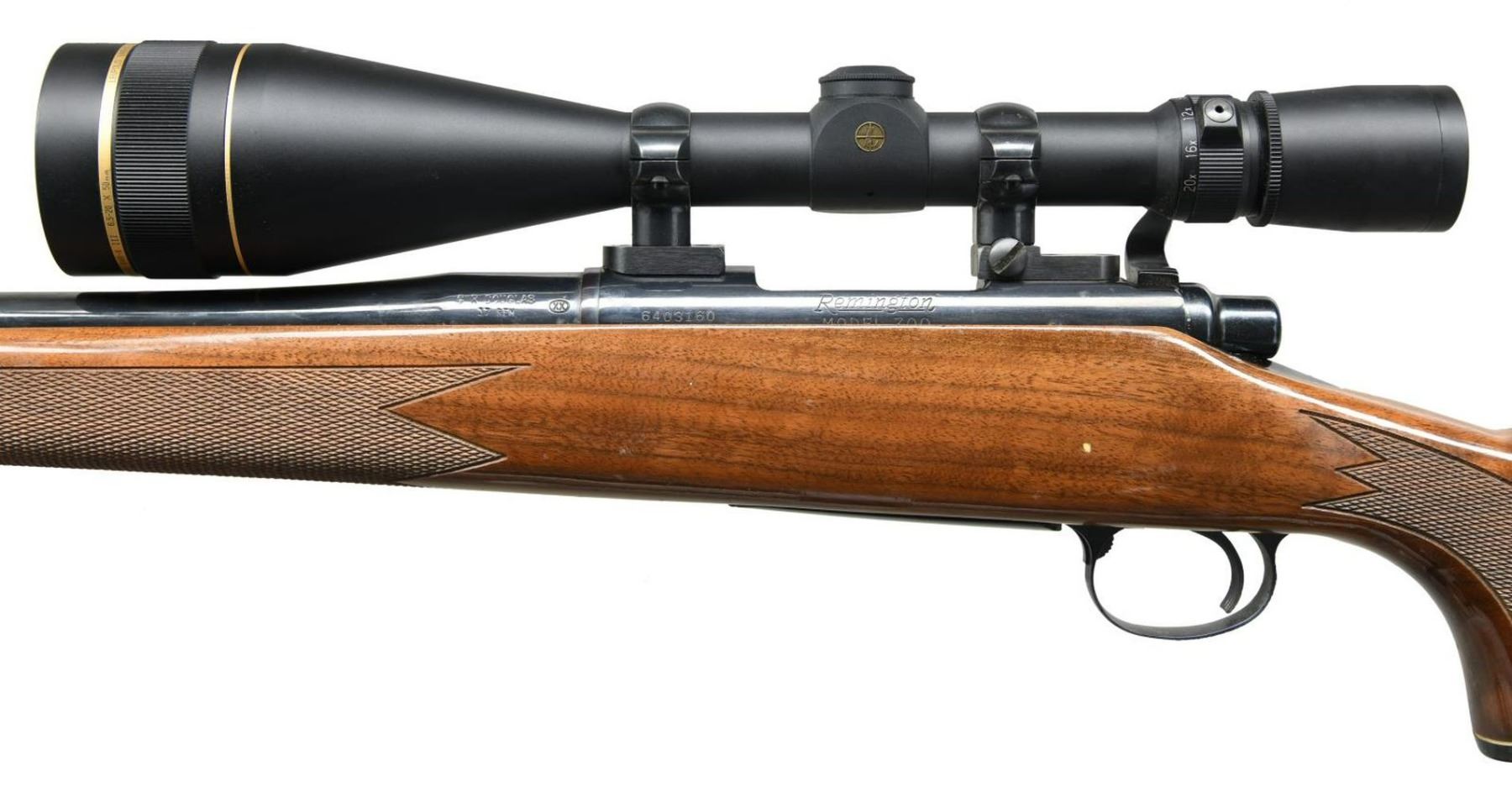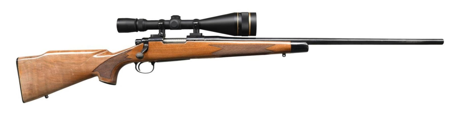 Cal. 17 Rem. S# 6403160. Bbl. 26" Douglas replacement. Leupold VARI-X 6.5-20x50mm scope w/ fine crosshair reticle & center dot. Scope has very good plus optics & is on Burris mounts. Checkered Monte Carlo walnut stock w/ left side cheekpiece & bottom mounted sling studs. CONDITION: stock shows some light flaking, staining & handling wear. Metal retains 75% blue w/ scattered oxidation & fading. Very good bore. (23-2648/MJC). MODERN. $500-900.