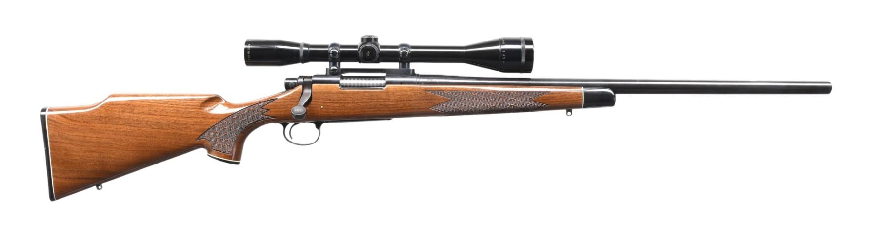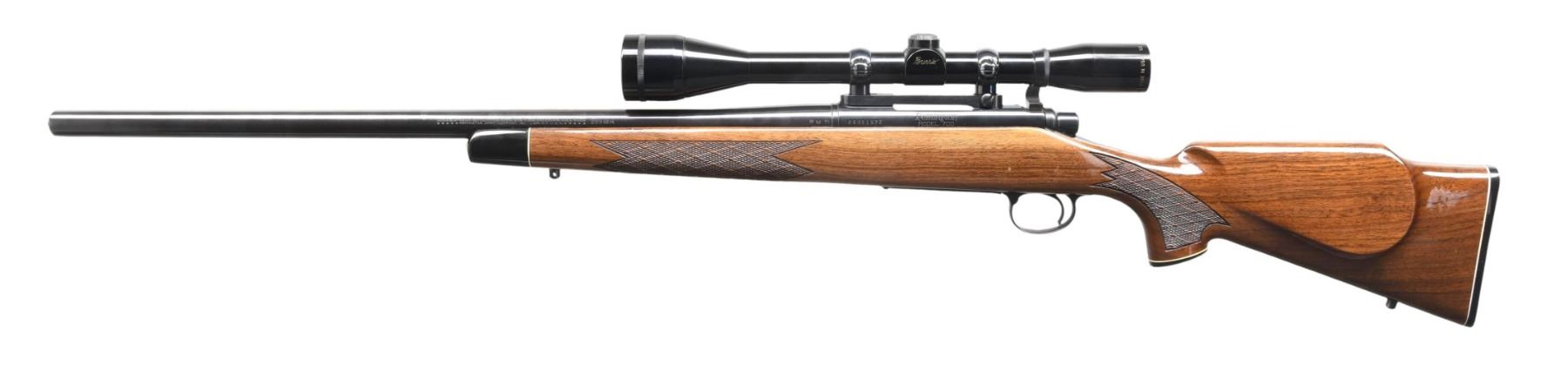 RIFLE. Cal. 223 Rem. S# C6351972. Bbl. 24". Rifle is sighted with a Burris 12x power Fullfield scope. Scope has duplex crosshair reticle and very good optics. Blued and anodized finishes. Checkered walnut stock with left side cheekpiece, bottom mounted sling studs, ebony tip, and checkered black plastic buttplate. LOP: 13 1/2". CONDITION: stock has glossy varnish with a couple light handling marks. Metal retains 98% original finishes with some light handling and edge wear. Action functions properly when hand-cycled. Bright, near excellent bore. (24-5848/MJC). MODERN. $800-1,200.