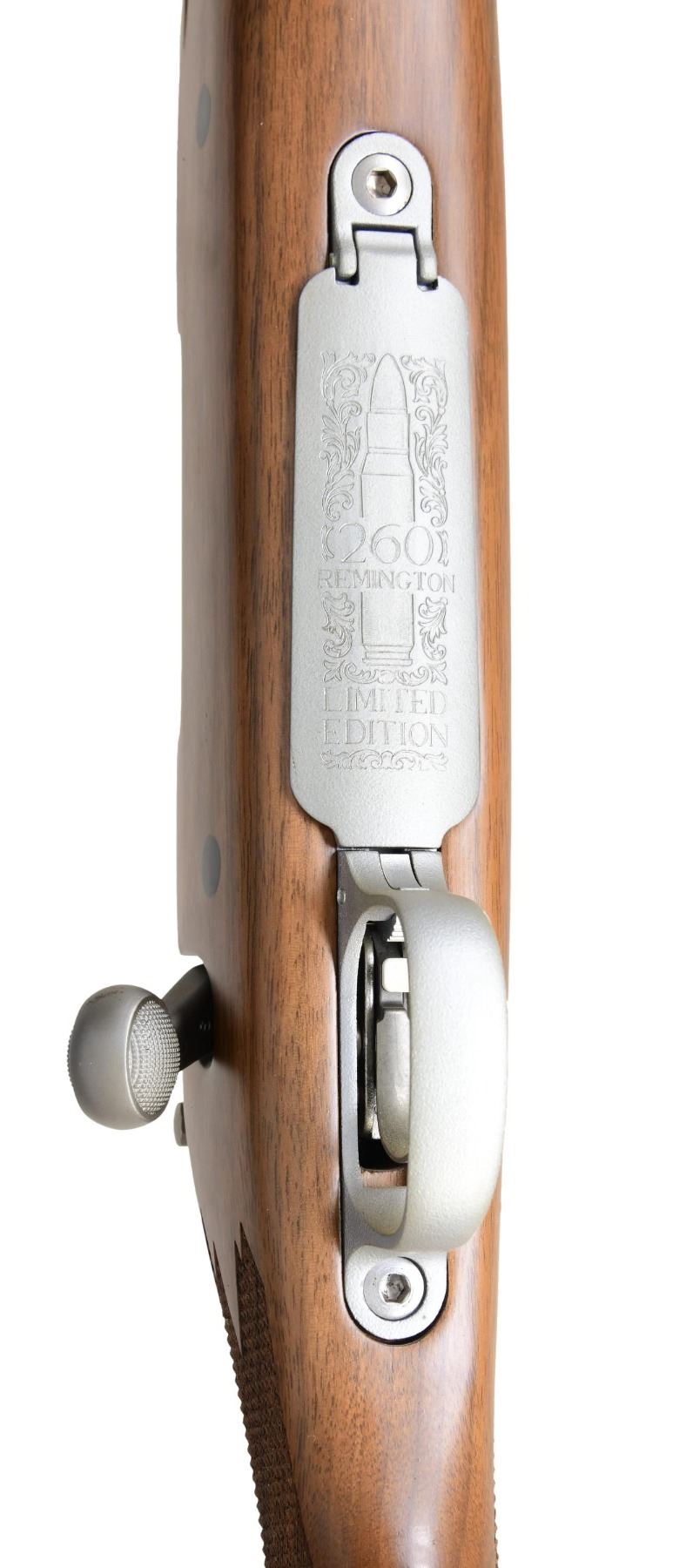RIFLE. Cal. 260 Rem. S# S6653072. Bbl. 24" fluted w/o sights. Floorplate has special 260 Rem limited edition markings. Classic style cheekpiece walnut stock. Features include cut checkering, black forearm tip & grip cap, swivel bases & solid black Remington pad. Limited edition mfg. 2008. UNATTACHED ACCESSORIES: original box containing owner's manual, hang tag & trigger lock. Box shows mildew from moisture damage. CONDITION: near new, appears unfired. (24-4339/DS). MODERN. $1,000-1,300.