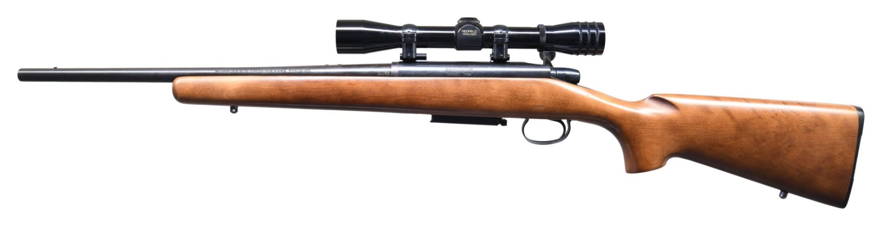 Cal. 7mm-08 Rem. S# B6122785. Bbl. 18 1/2" w/ sights removed. Redfield Tracker 4x32 gloss finished scope w/ duplex reticle on Weaver style mounts. Short throw action features nine locking lugs. Straight comb pistol grip hardwood stock w/ buttplate & swivel bases. MAGS: 1 detachable 3 rd. Mfg. 1967-1983. CONDITION: over 98% blue. Original stock finish shows a few marks. Bright near excellent bore. Scope has clear optics. (24-3382/DS). MODERN. $500-800.