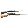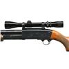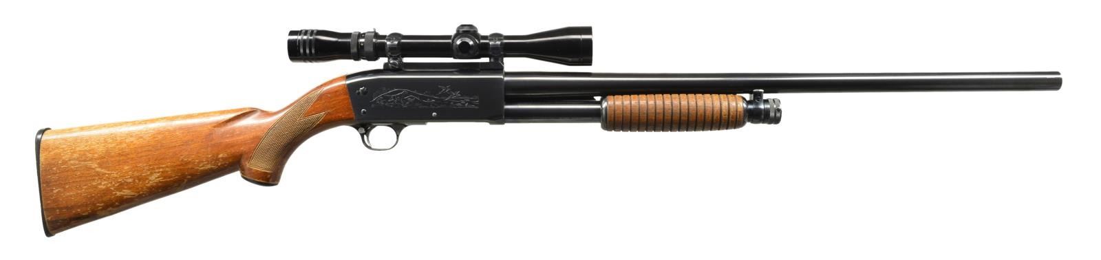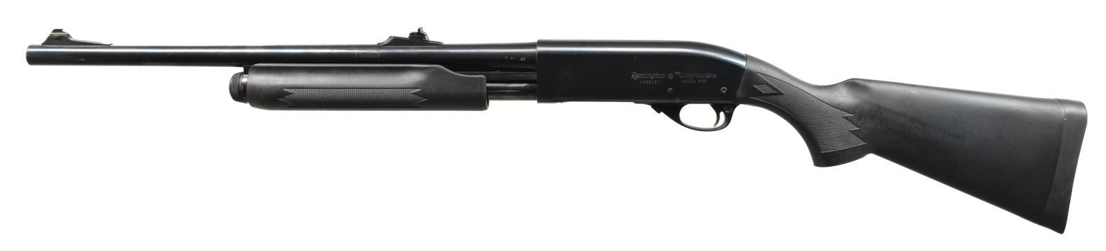SHOTGUNS. ALL: cal. 12 Ga., 2 3/4". 1) REMINGTON 870 WINGMASTER. S# V499067V. Bbl. 20" smooth bore w/ cyl. choke. Ramp mounted bead front sight w/ adj. U notch rifle rear sight. Blue finish. Rem. injection molded stock & forearm. CONDITION: 90% blue. Stock shows sm. scuffs. Bore is bright showing some plastic fouling near muzzle. (20-2224/DS). 2) ITHACA 37. S# 452133. Bbl. 24" fully rifled ER Shaw custom permanently fixed on early Ithaca action for non interchangeable bbls. Grooved walnut forearm & original checkered pistol grip walnut stock. LOP: shortened to 14" over reattached buttplate. Redfield 3x-9x Widefield gloss finished scope w/ duplex reticle on Redfield mts. CONDITION: bbl. & action retain 95% reblued finish. Wood has worn & peeling finish. Stock has sm. crack right of trigger guard. Near excellent bore. (20-2246/DS). ALL MODERN. $750-1,100.