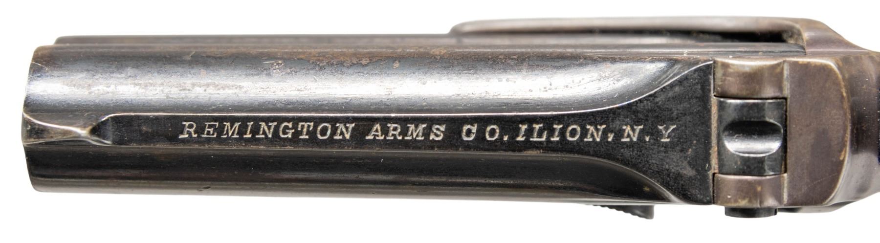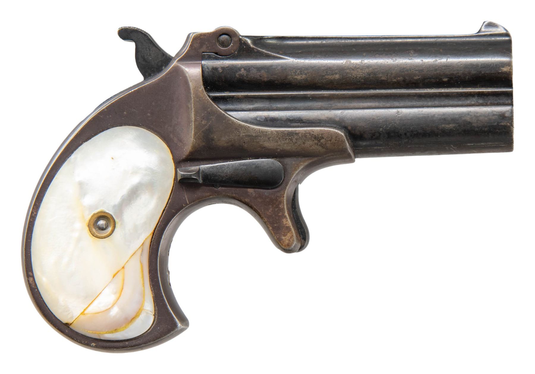 Cal. 41 RF. S# 40. Appears to be mfg. 1899. Bbls. 3". Pearl grips. CONDITION: reblued finish with oxidation. Right pearl grip has glue repairs; left panel is good. Fair rifling with pitting. PROVENANCE: The Esteemed Norm Greenberg Collection. (25-7025/MD). CURIO. $250-350.