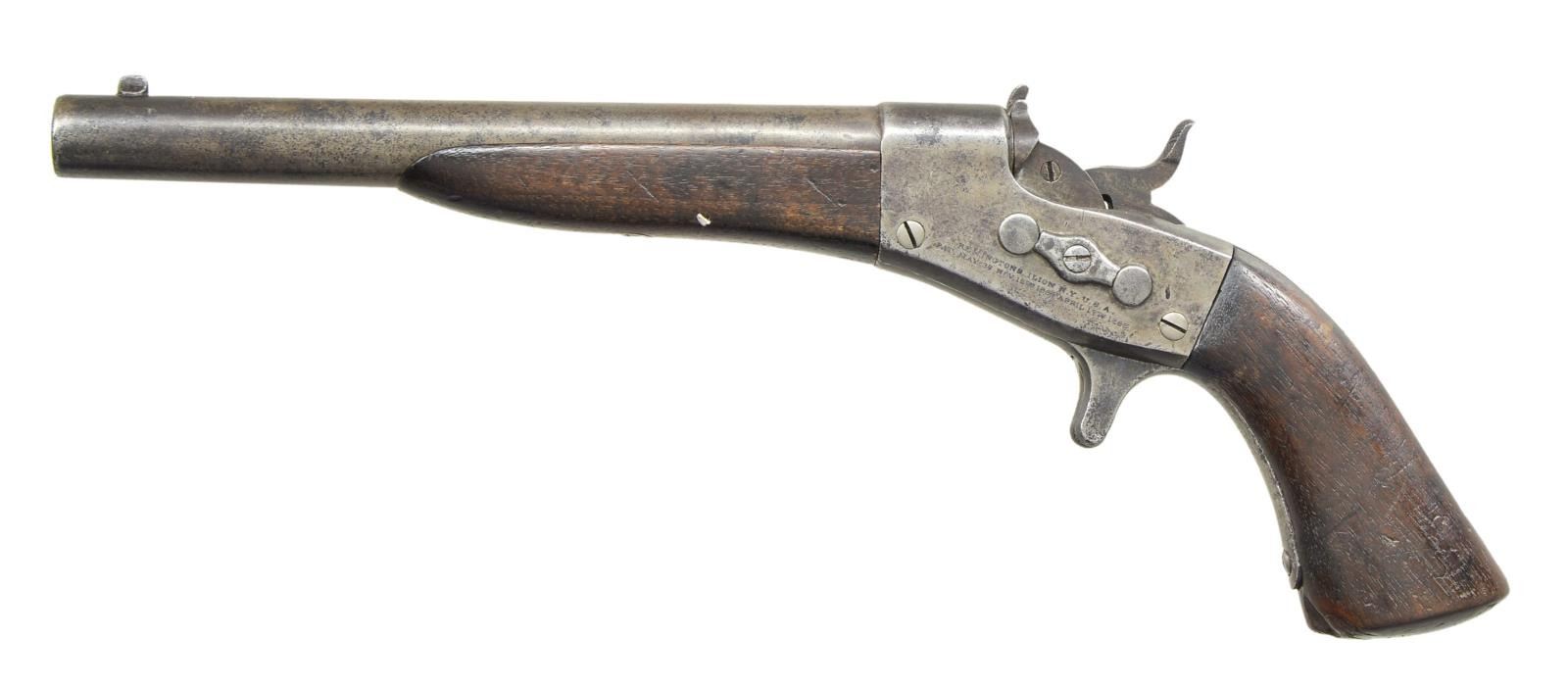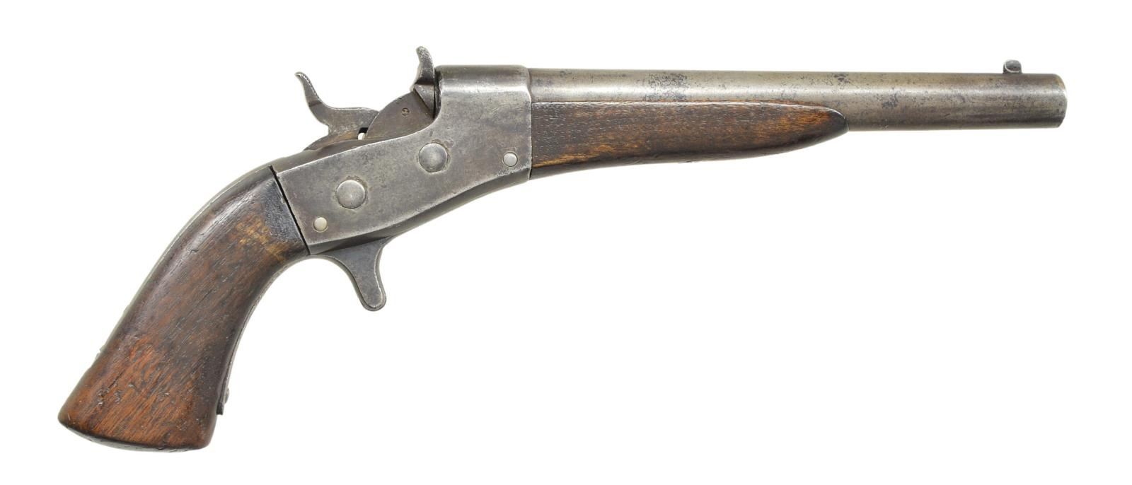 Cal. 50 RF. NSN. Bbl. 8 1/2" with pinched front sight blade. Mfg. 1866-1870; approx. 6,500 units by revised research. Earliest model with spur trigger and bottom center extractor nub. Underside of barrel (under forend) numbered 8 and inside of grip numbered 173; no numbers on sides of tangs. CONDITION: fair patina appearance with cleaned surfaces. Handling marks on wood plus chip on butt of grip. Fair bore with worn distinct rifling, even light pitting plus spot of oxidation. (01-22138/NW). ANTIQUE. $500-800.