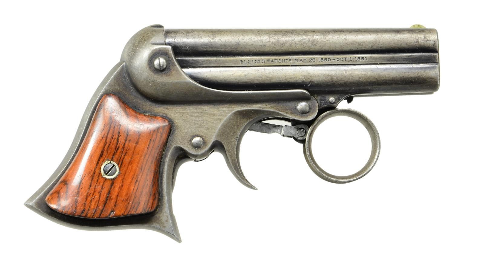 Cal. 32 RF. S# 21256. Bbls. 3 3/8" clustered in group of 4 w/ matching S# and brass blade sight; rotating firing pin. Mfg. 1863-1888; approx. 25,000 units. Less popular 22 RF model w/ 5 bbls. saw 10,000 mfg. Frame sides lowered after S# 18,000 to resemble 22 RF model. Ringed trigger operation of improved design based on previous Zig-Zag model. Blued finish w/ smooth walnut varnished grips. CONDITION: grey patina finish with some bright blue on protected areas of barrels. Very good grips with faint handling marks. Weak trigger return with fabricated trigger link. Proper firing pin rotation. Fair to good bright bores with scattered spots of pitting. (01-22143/NW). ANTIQUE. $250-400.