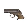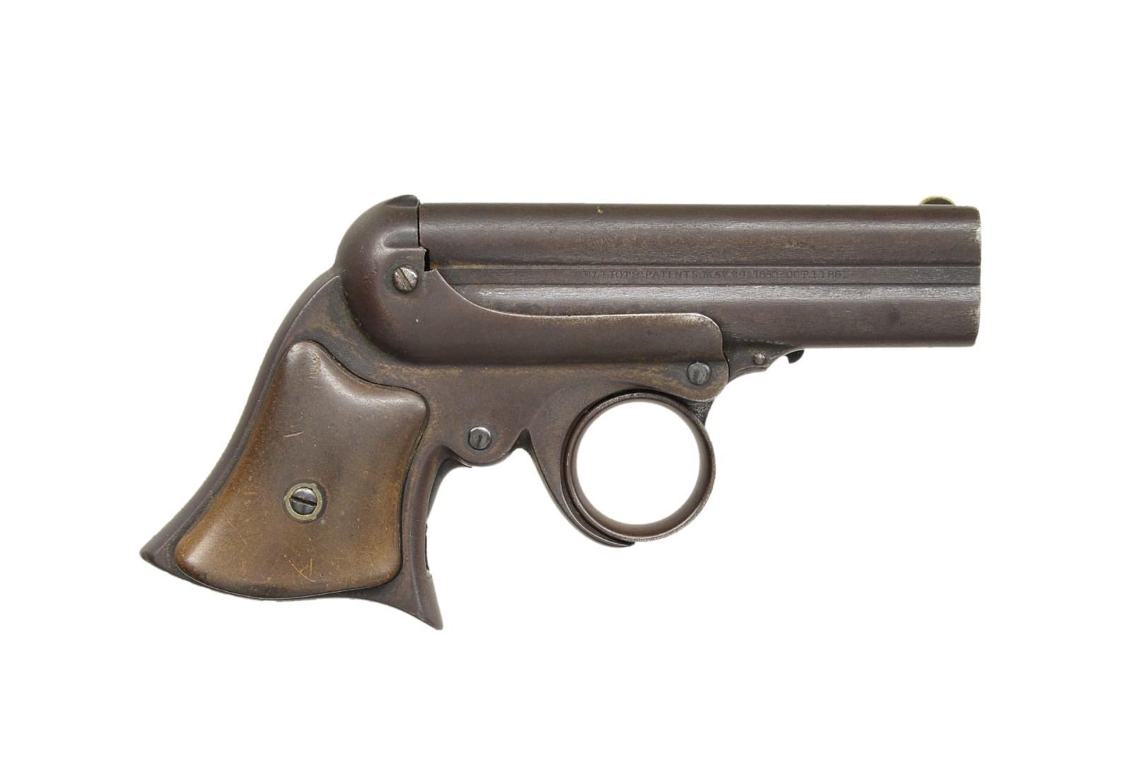 Cal. 32 RF. S# 36980. Bbls. 3 3/8" four shot cluster w/ semi circular German silver front sight. Iron frame w/ rotating firing pin & distinctive ring trigger. 2 Piece hard rubber grips. Mfg. 1863-1888. CONDITION: metal has faded to an attractive brown patina. Grips show light wear. Firing pin is not rotating properly when action is cycled. Dark bores w/ spots of pitting. (01-20046/DS). ANTIQUE. $400-600.