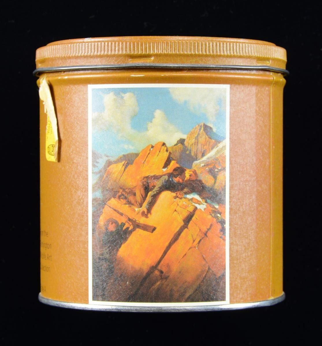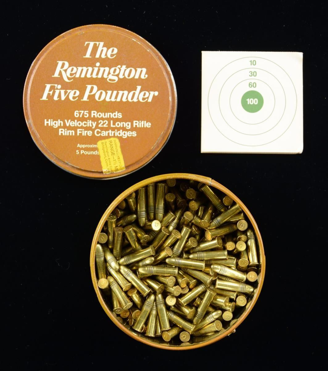 OF .22 LR AMMUNITION. Decorative can containing approximately 675 rounds of Remington .22 LR High Velocity ammunition. Exterior of can body panels from the Remington Wildlife Art Collection. Interior of can retains its target pamphlet and foam insert. CONDITION: good, with the exterior of the can showing some scattered marks and mild wear from storage and handling. Ammunition is all clean and serviceable. (02-20180/MLW). $40-60.