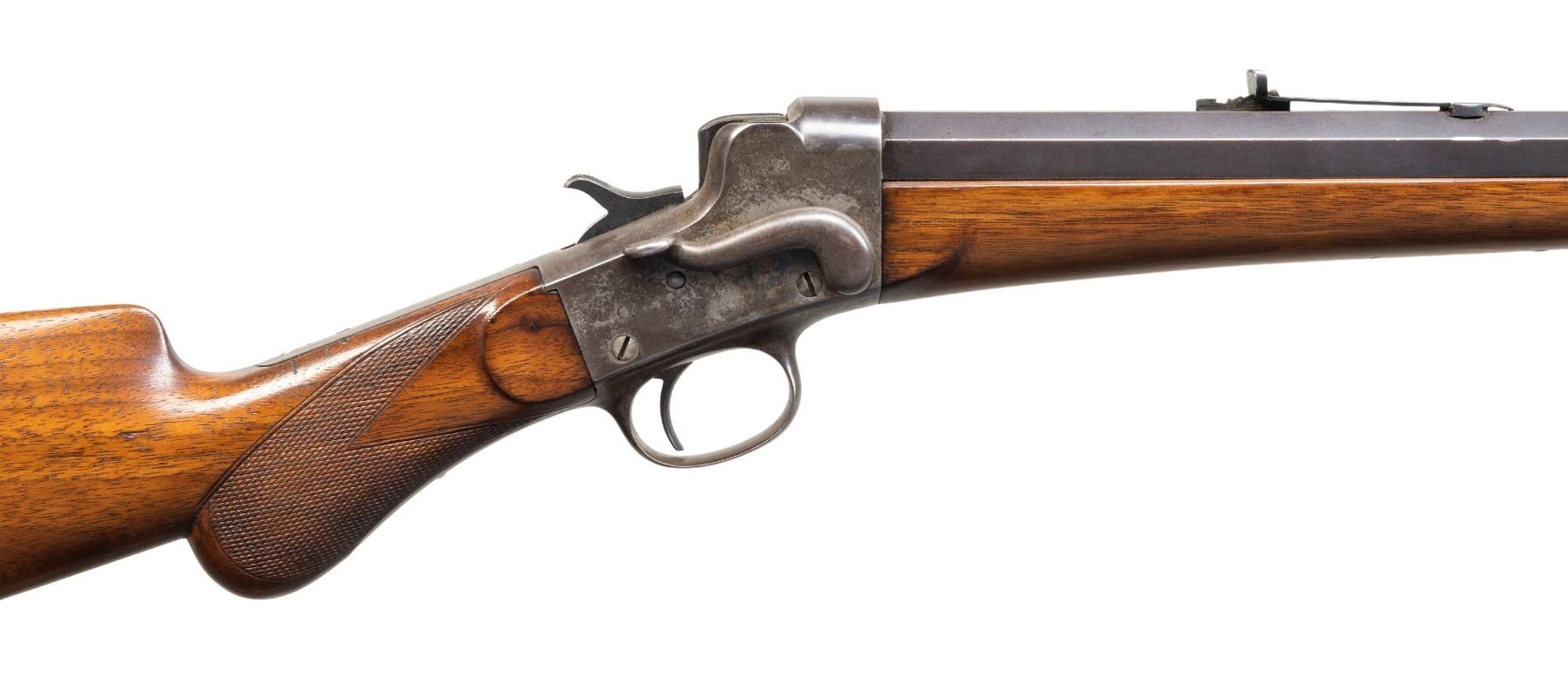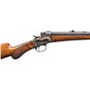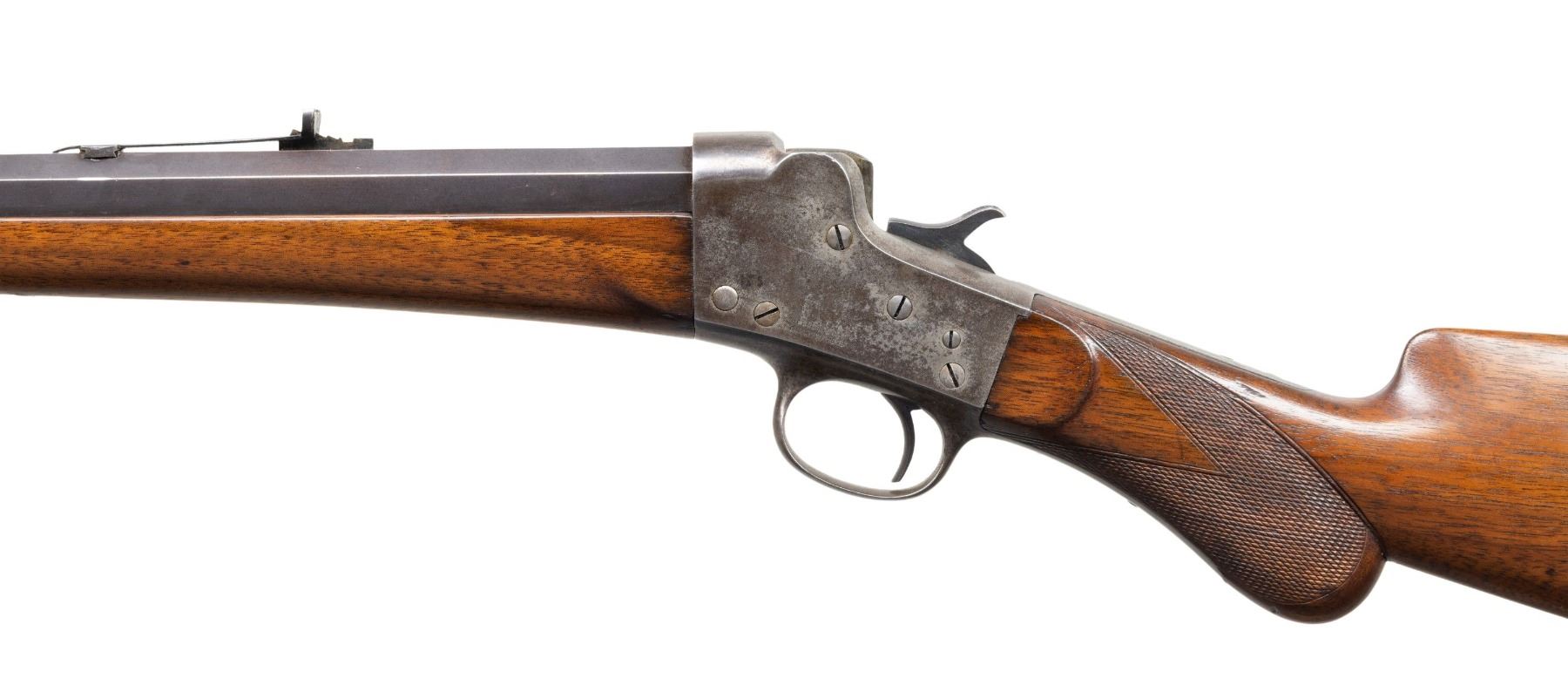 Cal. 32-40 B & M. S#. I-9804. Bbl. 26" octagon to round measuring 7/8" at the muzzle. Replacement Lyman bead front sight with sporting rear sight having a hand made replacement elevator. Blue finished bbl. Case colored side lever falling black action. Ebony tipped schnable forend and round knob walnut stock with checkered wrist and steel rifle buttplate. Weight 8 lbs. 4.4 oz. Mfg. 1883-1907. CONDITION: 50% fading bbl. blue. Action shows traces of case colors in protected areas. Refinished wood shows some handling marks. sound action. Bore is dark with worn rifling.PROVENANCE: Estate of Groves Herrick. (25-6731/DS). CURIO. $1,000-1,500.