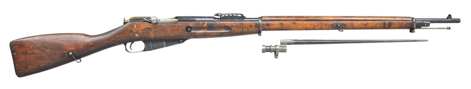 Cal. 7.62x54R. S #264408. Bbl. 31 1/2" import marked on right side. Bolt body Finn renumbered matching and other # S unnumbered. Bbl top marked with Remington banner, 1917 date and Czarist eagle. Left of Bbl. marked with Finnish boxed "S.A." marking. Top of hex receiver marked with Czarist eagle. Straight bolt handle. Ladder rear sight graduated to 3200 Arshins. Inverted V front sight. Finnish armory metal tag is present on bolt. Cleaning rod also present. Stock has Finn metal sling slots with wire hangers. Hardwood stock with Finnish splice ahead of grasping grooves. UNATTACHED ACCESSORIES: 17 1/2" M91 socket bayonet numbered "38420". Bayonet shows overall silvering and fading to gray with a few spots of light pitting. CONDITION: hardwood stock shows Finn rework finish, a couple dents, small crack rear right of handguard, scattered dings and handling marks. Metal retains 80% Finn arsenal reworked blue with some areas of blued over pitting, scattered silvering and thinning. Fair bore showing scattered pitting and frosting. (22-2523/MJC). CURIO. $300-400.