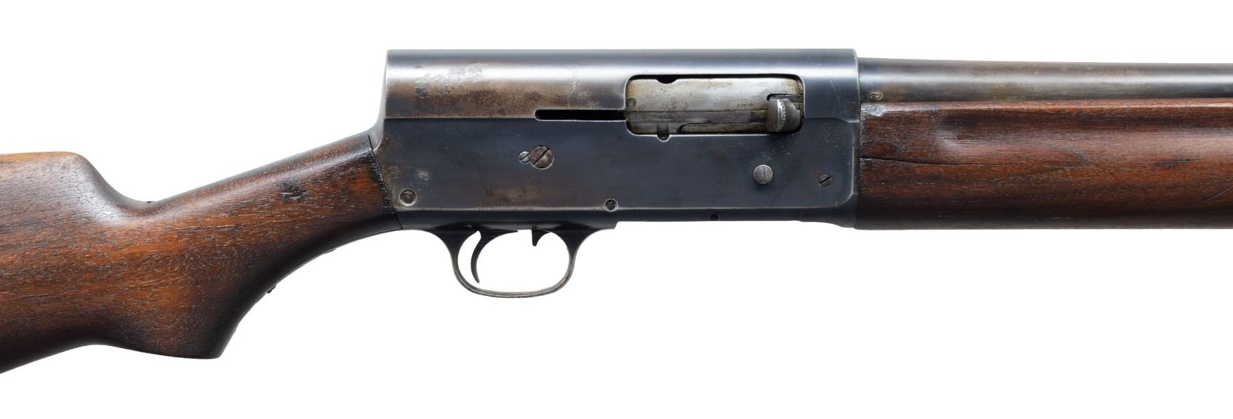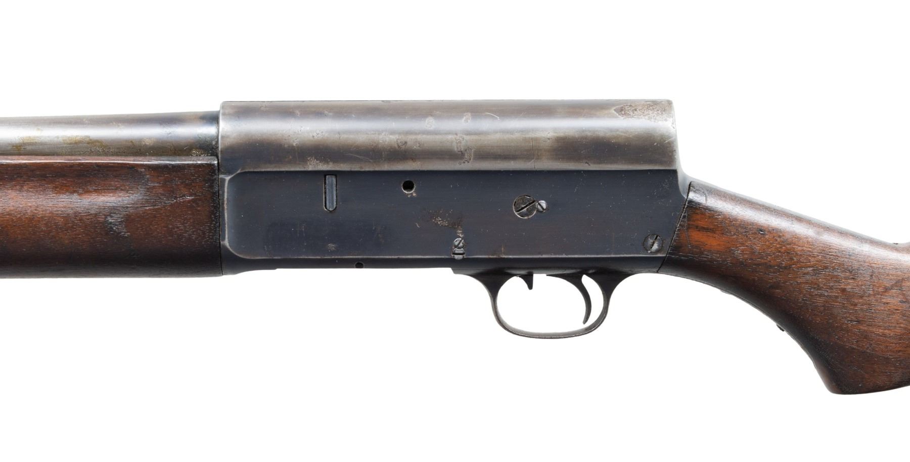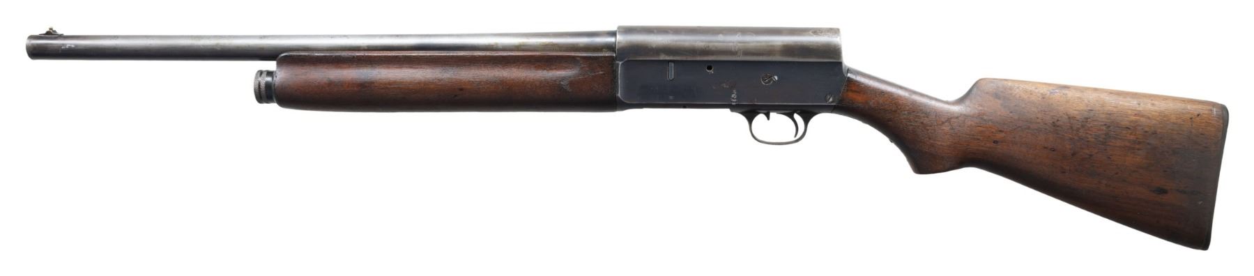 Cal. 12 Ga., 2 3/4" S# 185088. Mfg. approx. 1915. Bbl. 20" with steel bead & Cyl. bore. Tubular mag. Walnut stock set. CONDITION: fair worn blue mixed with gray/brown patina with areas of pitting throughout. Fair worn stock w/ large cracks. Very good shiny bore. (25-2771/MD). CURIO. $300-500.