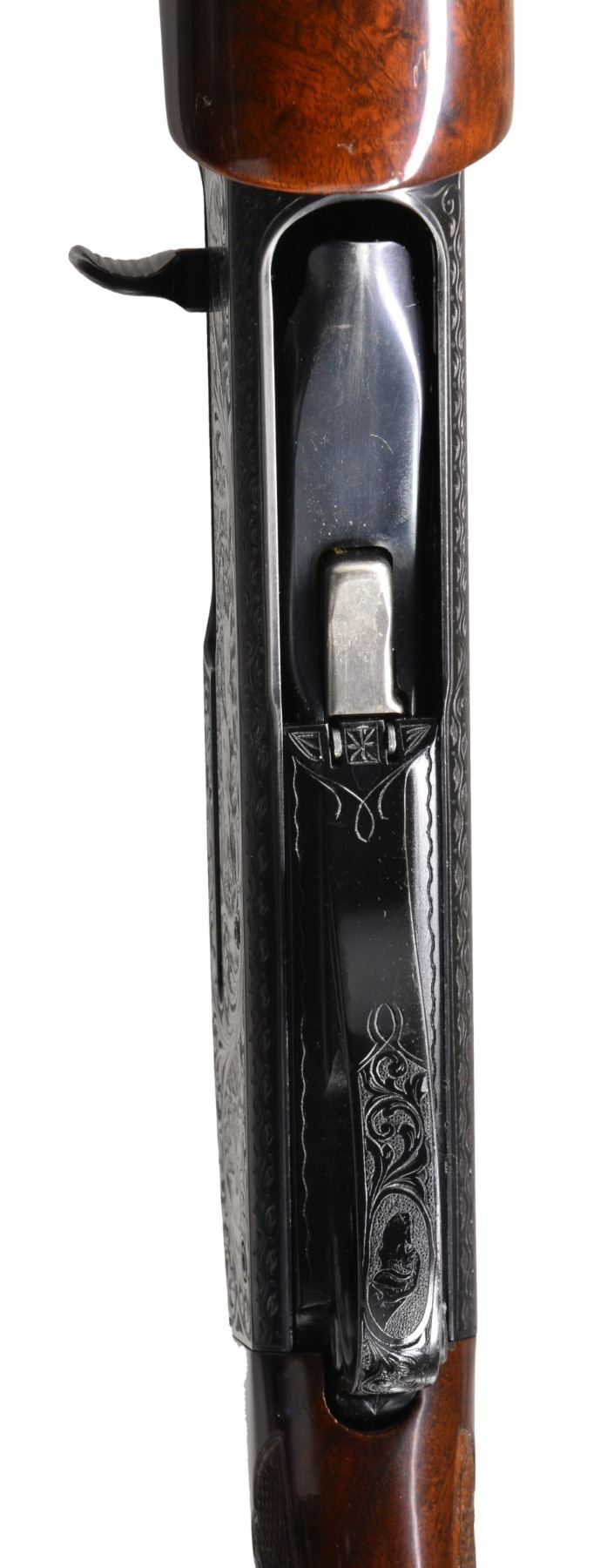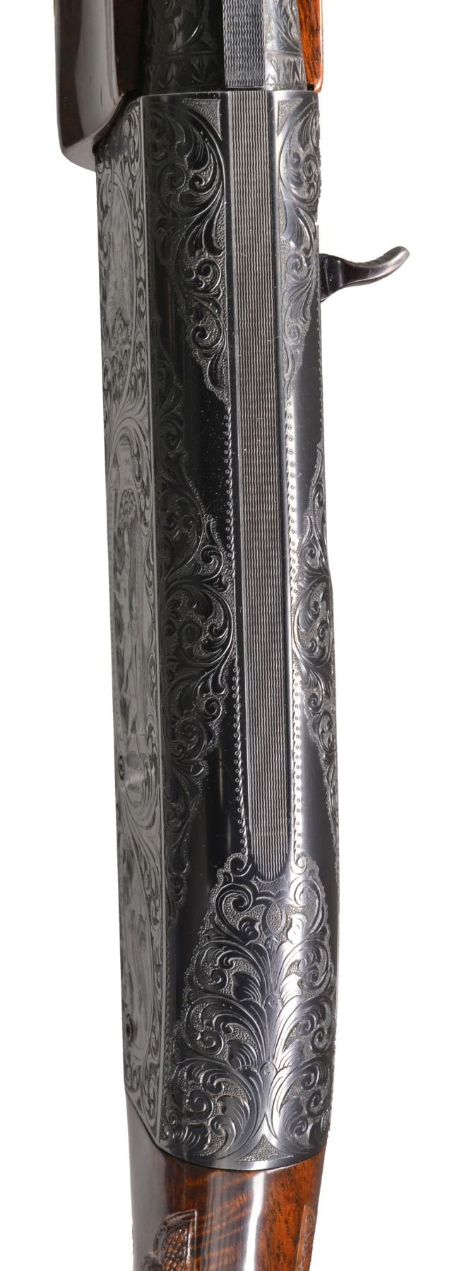 SHOTGUN. Cal. 20 Ga., 2 3/4". S# L-067114X. Bbl. (1) 25" VR w/ fixed Imp. Cyl. choke. Bbl. (2) 28" VR w/ fixed Full choke. Both bbls. have wedges of scroll engraving at breech end along w/ white target front sights & steel mid beads. Standard weight action as produced prior to 1977 has full coverage hand engraving. Engraving features vignettes of pointing dogs w/ flushing grouse & woodcock on right sight & pointing dogs along w/ flushing pheasant & mallard on left along with engraver initials "JC 70". Balance of action is covered w/ vine type foliate scroll engraving w/ punch dot backgrounds. Trigger guard bow has portrait of a pointer surrounded by scroll highlights. Forearm & pistol grip stock of gloss finished fancy walnut w/ fancy spade style hand checkering. Stock features include black grip cap w/ white diamond & white line spacer, brass oval name plate in toeline & original buttplate w/ white line spacer. LOP: 13 7/8". WEIGHT: w/ 25 1/2" bbl., 7 lbs., 12.1 oz. CONDITION: action retains over 97% original blue showing slight carry wear around loading port. Both bbls. retains over 99% original bbl. & have very nice bright bores. Original stock finish shows scattered scuffs & handling marks. (20-543/DS). MODERN. $3,000-4,000.