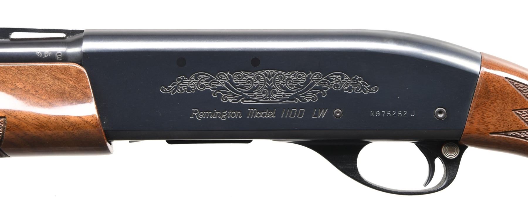 SEMI-AUTOMATIC SHOTGUN WITH SPARE BARREL. Cal. 28 GA, 2 3/4". S# N975252J. Bbl. 25". Model 1100 Lightweight semi-automatic shotgun, mfg. by Remington. Left side of the bbl. is marked with the cal. designation, followed by "SKEET", with the right side exhibiting Remington's mfg. information. Sides of the receiver are engraved with foliate motifs, with the left being marked "Remington Model 1100 LW", followed by the S#, and with "SKEET-T" marked on the right. Steel receiver and bbl. exhibit a blue finish, with the aluminum trigger guard exhibiting a black anodized finish. Checkered wood pistol grip buttstock and forend. Matte V/R and white plastic bead front sight, with weighted mag. tube end. UNATTACHED ACCESSORIES: 1 spare 25" bbl. featuring a matte V/R and threaded Modified choke. CONDITION: excellent, with metal components retaining bountiful amounts of their original factory finishes overall. Mirror bore, exhibiting some light firing residue. Wood furniture is excellent overall. Spare bbl. is excellent and retains a mirror bore. (24-3961/MLW). MODERN. $1,000-1,500.
