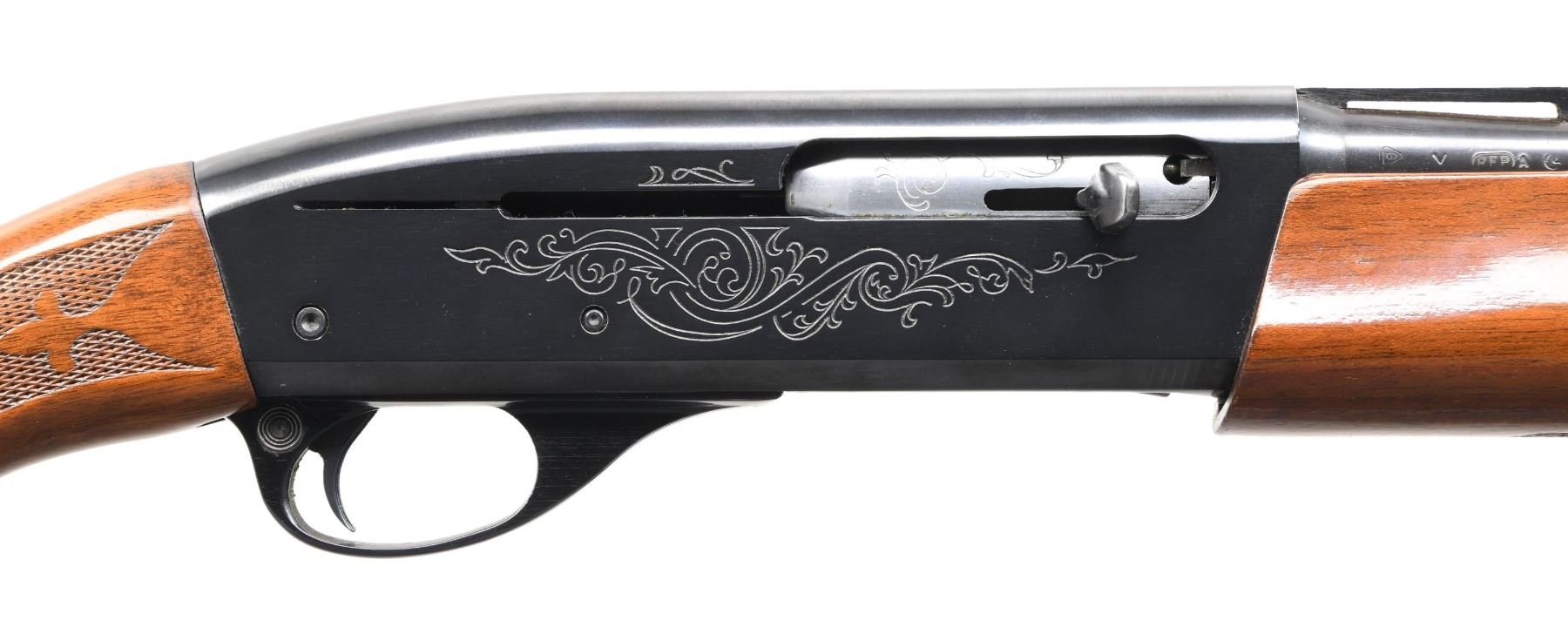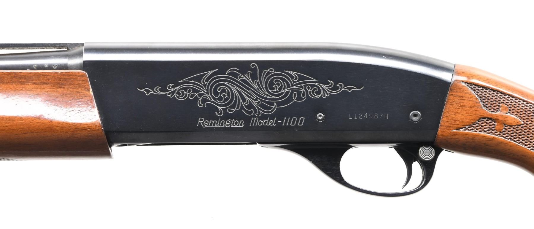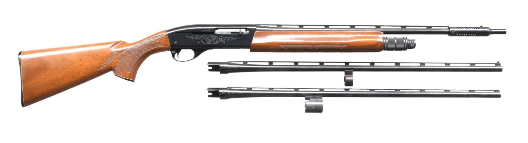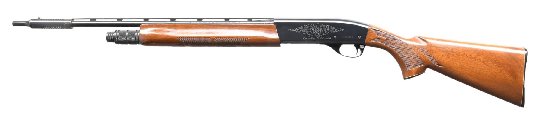 SPARE BARRELS. Cal. 410 GA, 3". S# L124987H. Bbl. 18 1/4". Model 1100 semi-automatic shotgun mfg. by Remington. Left side of the bbl. is marked with the cal. designation, followed by "FULL", with Remington's mfg. and patent information marked on the right. Sides of receiver exhibit light scroll engraving, with the left side also exhibiting the Remington trademark logo, followed by the model designation and S#. Receiver and bbl. exhibit a blue finish, with the aluminum trigger guard exhibiting a black anodized finish. Checkered wood fleur-de-lis pistol grip buttstock and forend. Matte V/R with Lyman Cutts compensator, white plastic bead front sight, and weight mag. cap. UNATTACHED ACCESSORIES: 2 spare 25 1/8" bbls., 1 with a fixed Modified choke, and the other with a fixed Full choke. CONDITION: metal components retain the vast majority of their original factory finishes, exhibiting some light edge wear, as well as some superficial marks from handling and storage. Mirror bore. Wood furniture shows some scattered marks and impressions from handling and storage, but otherwise remains sturdy and serviceable. Spare bbls. show some light wear and a few scattered spots of light surface oxidation, while retaining mirror bores. (24-3960/MLW). MODERN. $600-1,000.