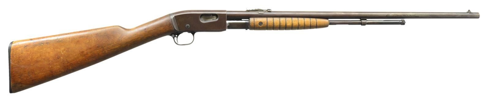 Cal. 22 S, L, LR. S# 327846. Bbl. 22" rnd. w/ sporting sights. Tubular mag. Sm. rnd. grooved forearm & straight grip walnut stock w/ hard rubber buttplate. CONDITION: metal finish is fading to brown showing spots of corrosion & light pitting. Wood has heavy worn appearance showing scratches & marks. Functioning action. Bore has dark appearance w/ pitting & worn rifling. (21-4366/DS). CURIO. $200-300.
