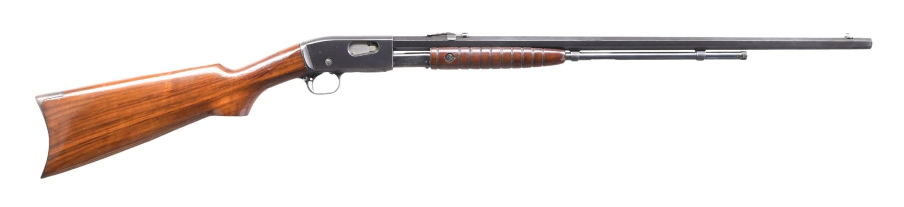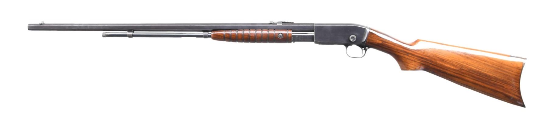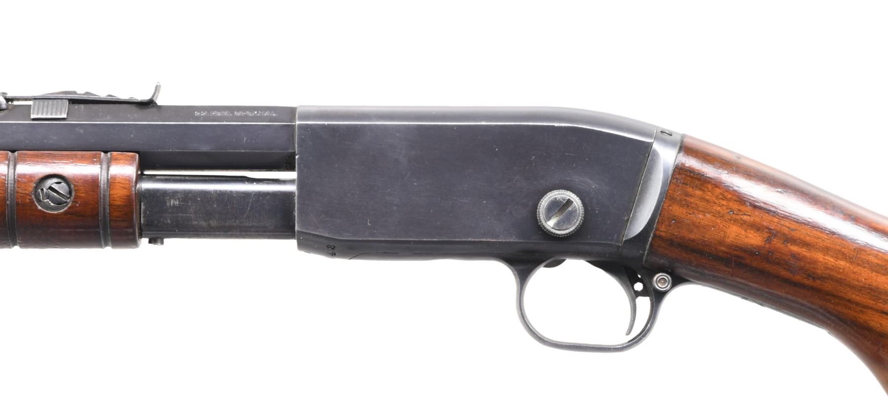 Cal. 22 Rem Spec. S# 588048. Bbl. 24" octagon w/ original sporting sights. Tubular mag. Grooved forearm & pistol grip walnut stock w/ crescent steel buttplate. Bottom of pistol grip has hand-scratched marking that may be "TB". CONDITION: 90% lightly faded blue. Original wood finish shows scratches, marks & wear spots. Very good bore. PROVENANCE: The estate collection of Don "Duck" Combs. (24-2438/DS). CURIO. $800-1,200.