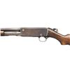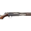 Cal. 25 Rem. S# C14794. Bbl. 22". Model 14 slide action rifle mfg. by Remington. Top of the bbl. is marked with Remington's 3-line mfg. and patent information, with the Remington trademark logo and cal. designation marked on the left. Left side of the receiver features a brass inlay marked "UMC/ U/ 25REM". Metal components exhibit a blue finish overall, save for on the bolt assembly, which is polished in-the-white/ Grooved wood pump and plain wood pistol grip buttstock with period replacement clear synthetic buttplate. Aftermarket Lyman natural white beaded blade front sight with Lyman flip-up tang sight. Factory rear sight is absent. CONDITION: metal components retain fair to good amounts of their original factory blue finish, exhibiting areas of wear and thinning fading to gray and brown patinas, as well as scattered spots and areas of light to mild surface oxidation overall. Left side of receiver and action bar exhibit patches of moderate surface oxidation. Bore is relatively bright, exhibiting consistent mild pitting, while retaining strong rifling throughout. Proper manual mechanics. Wood furniture shows scattered marks and impressions from handling and storage. Right side of pump exhibits a small chip, with a small crack present on the left side of the wrist of the buttstock, stemming from the receiver. PROVENANCE: Estate of Groves Herrick. (25-5709/MLW). CURIO. $300-500.
