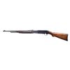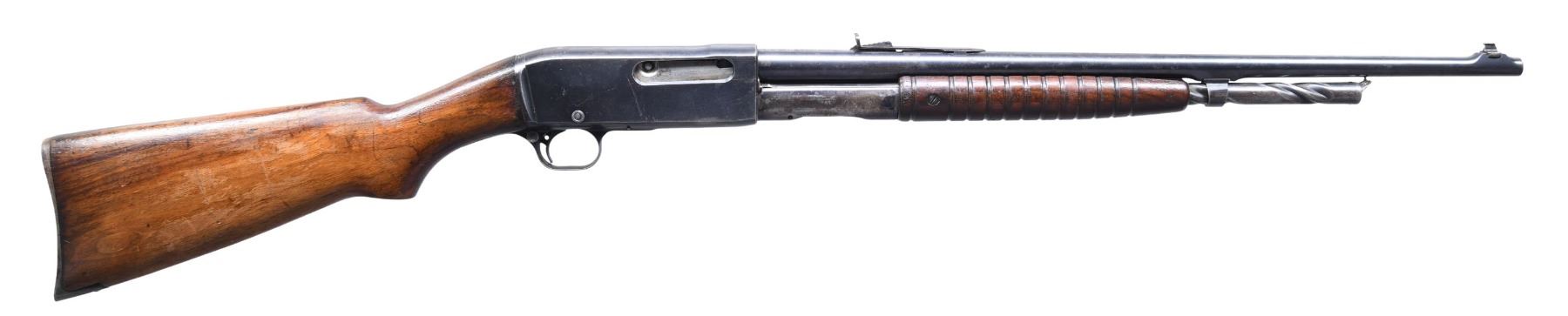 Cal. 30 Rem. S# C85948. Bbl. 22". Model 14A slide action rifle mfg. by Remington. Top of the slide is marked "MODEL 14-A.", with Remington's mfg. and patent information, trademark logo, and the S# marked towards the breech. Metal components exhibit a blue finish overall, with the bolt being polished in-the-white. Plain wood pistol grip buttstock and grooved pump have been sanded and revarnished at one time. Brass beaded blade front sight, with U-notch rear sight. CONDITION: metal components retain large amounts of their original factory blue finish, exhibiting some areas of mild wear and thinning, with mild surface oxidation and pitting present overall. Buttplate exhibits an area of moderate oxidation at the upper edge. Bright bore, exhibiting consistent light to mild pitting, while retaining strong rifling throughout. Wood furniture shows scattered marks and minor impressions from handling and storage, but otherwise remains sturdy and serviceable. (24-7121/MLW). CURIO. $250-350.